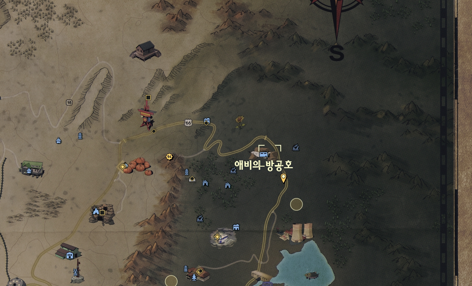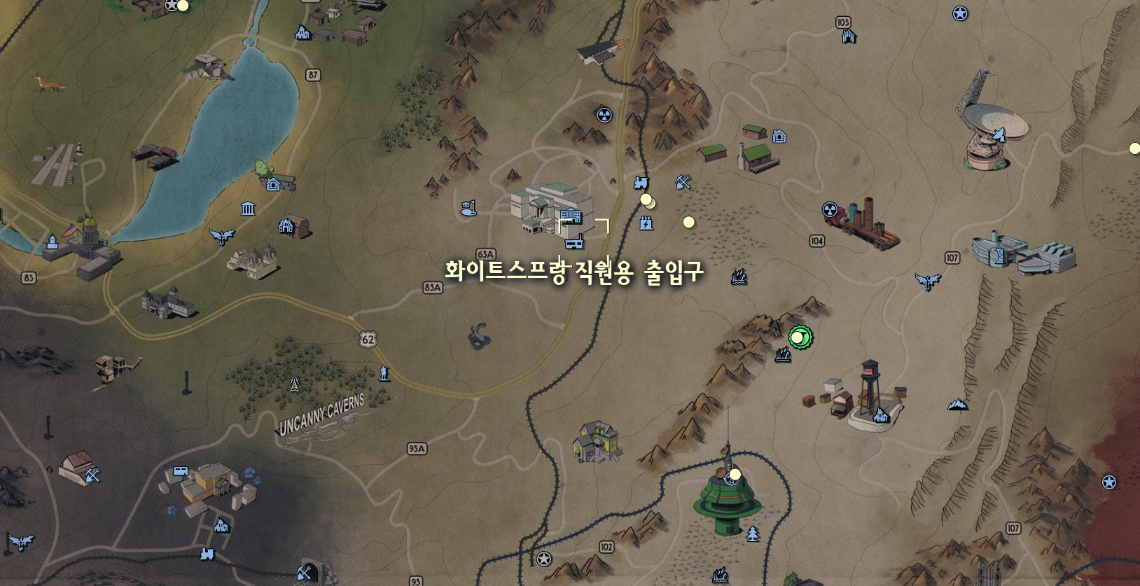 | 화이트 스프링 직원용 출입구 | 애비의방공호 | 나무 위 오두막 마을 주변 강가 |