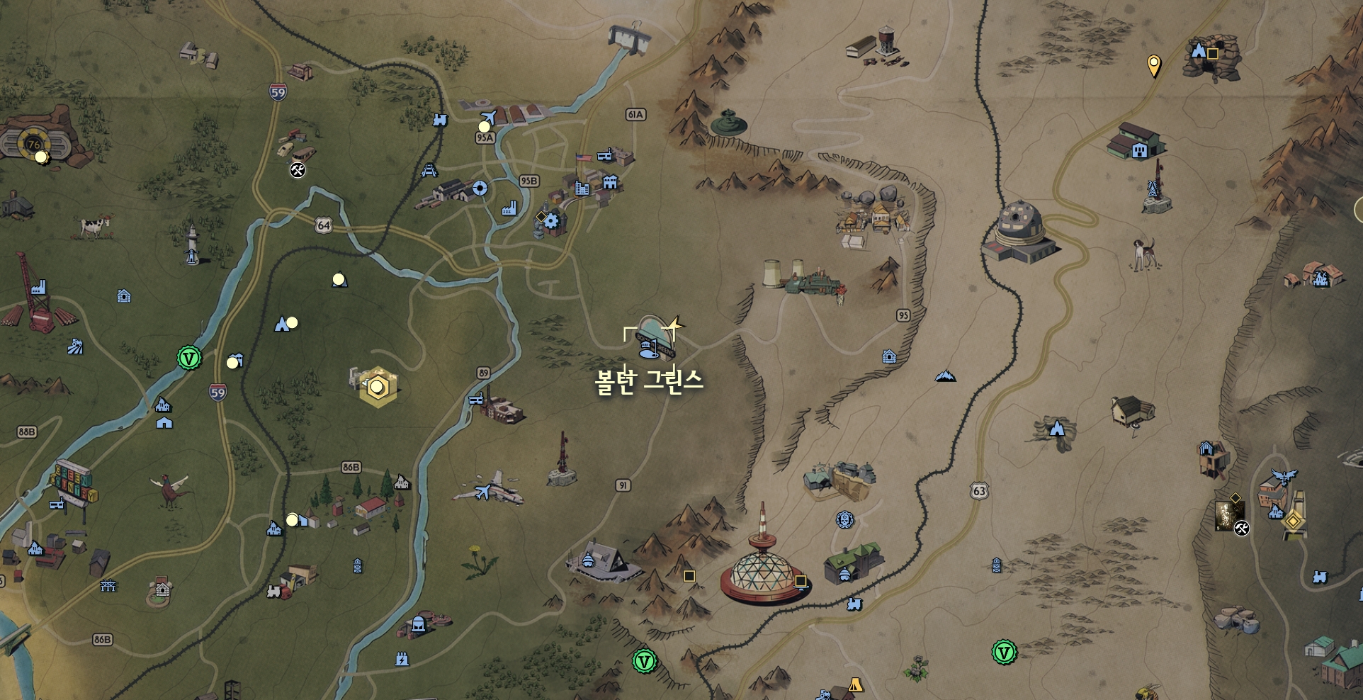 맵의 정 중앙 골프장의 화이트 스프링 리조트 빨간색 자동차 위에서 안셀을 발견하실 수 있습니다.