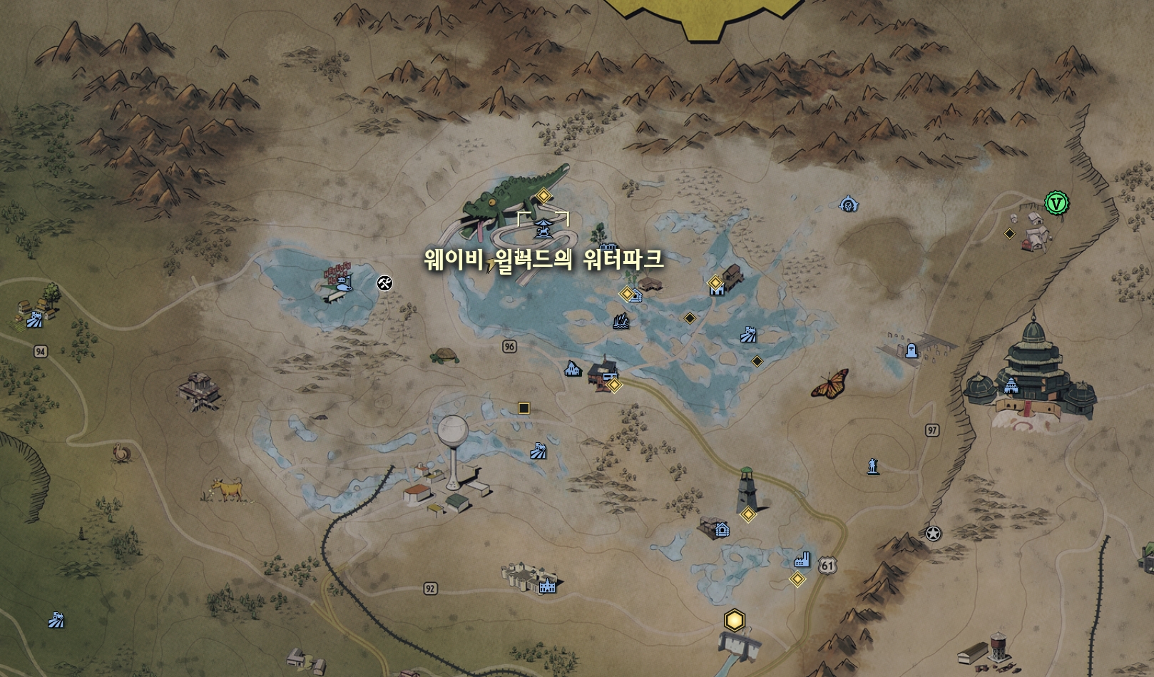 맵의 12시에 위치한 웨이비 월러드의 워터파크 주차장 자동차에서 안셀을 만나실 수 있습니다.