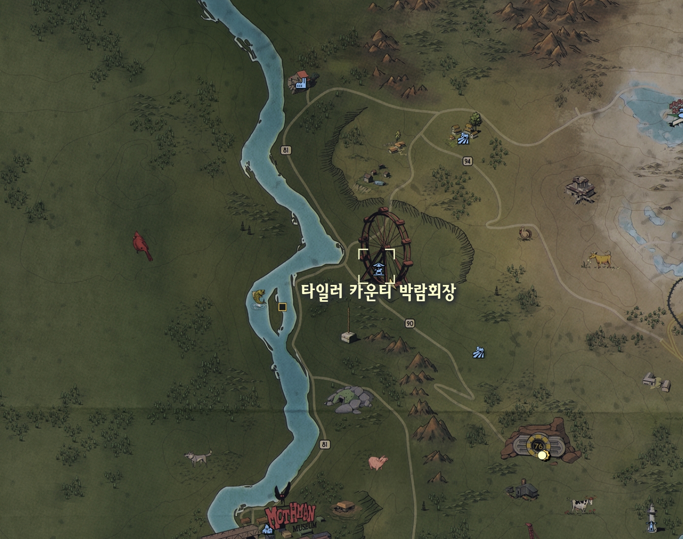 맵의 11시에 위치한 놀이동산 타일러 카운티 박람회장에서 오른쪽 의자가 많은 곳에서 발견하실 수 있습니다.