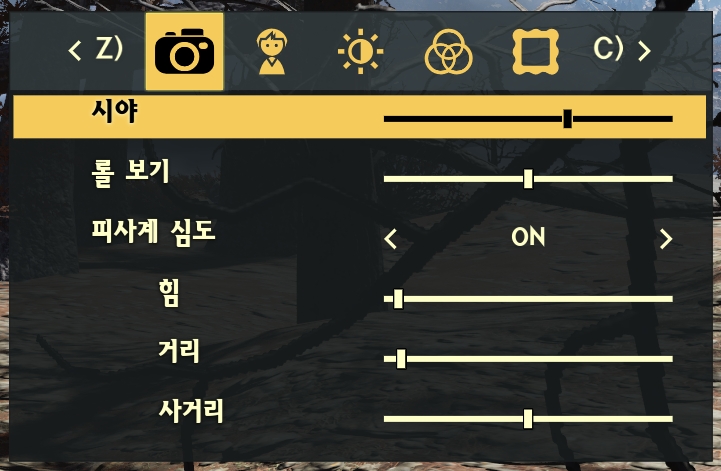 또한 메뉴 > 사진 모드를 통하여 피사계, 거리, 사거리, 시야 등 조절도 가능합니다.