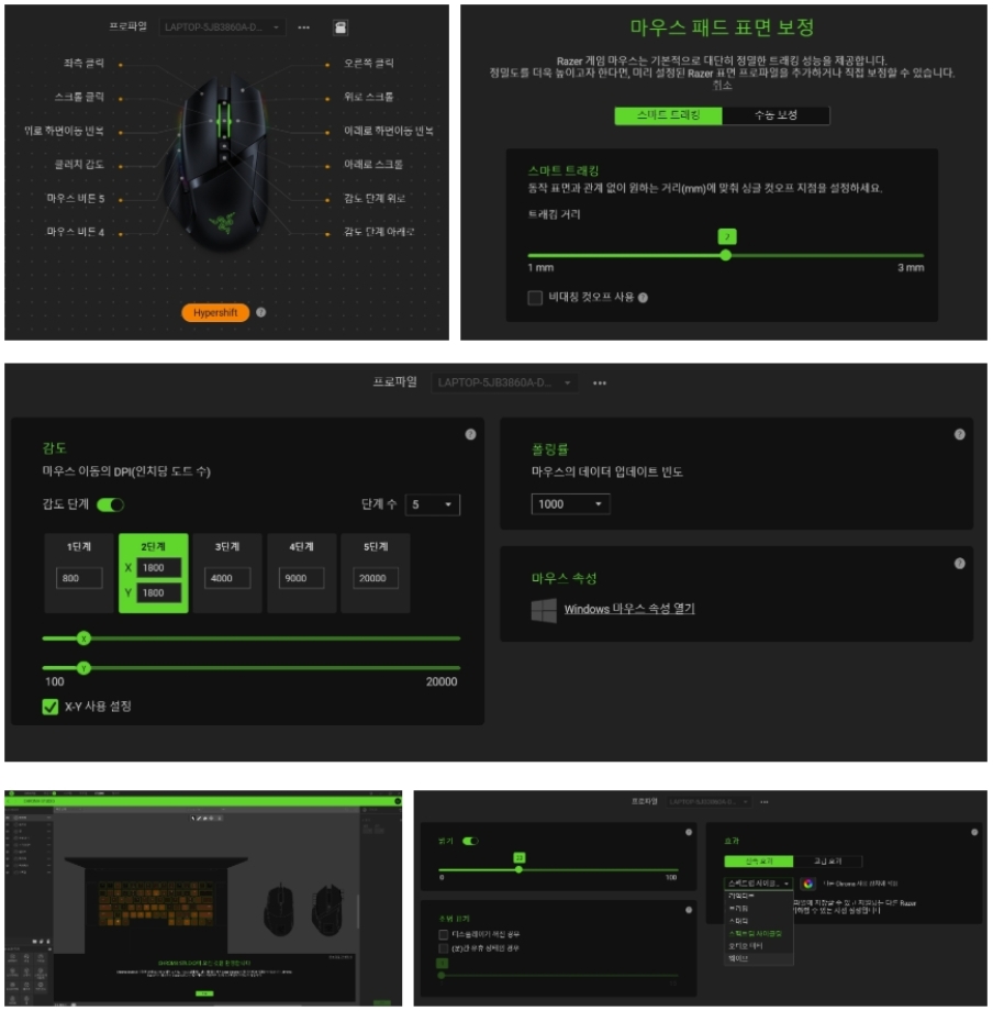 기본 민감도 설정 버튼 조정(800, 1,800, 5,000, 9,000, 20,000) 레이저 시냅스를 통한 유저가 원하는 민감도 설정 가능(X, Y 축 따로 설정 가능)