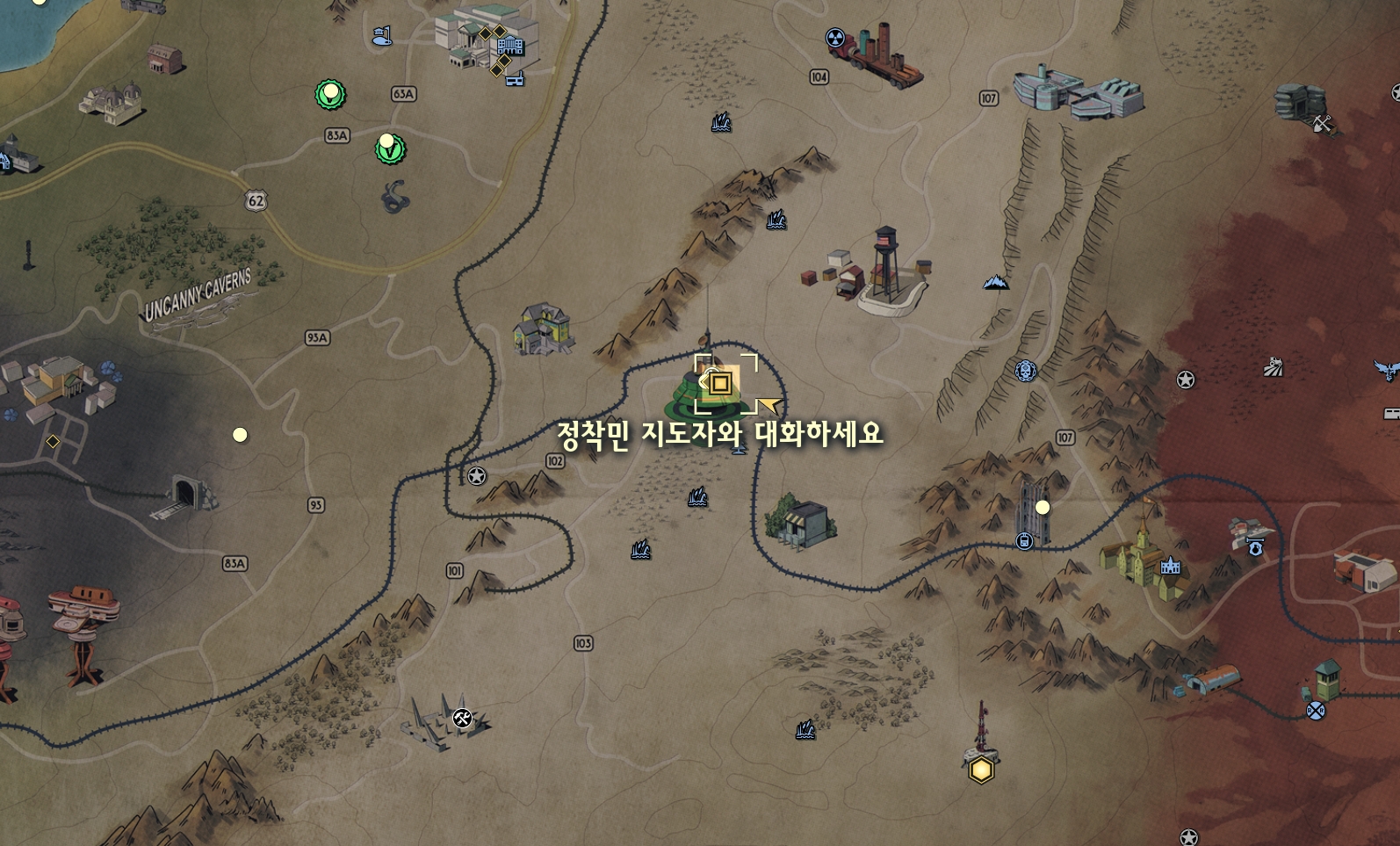 맵의 6시방향에 있는 파운데이션에서 정착민 지도자 페이지와 대화를 나누세요.