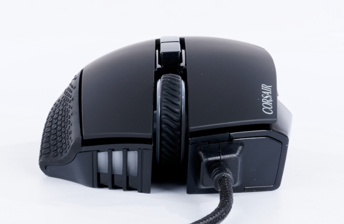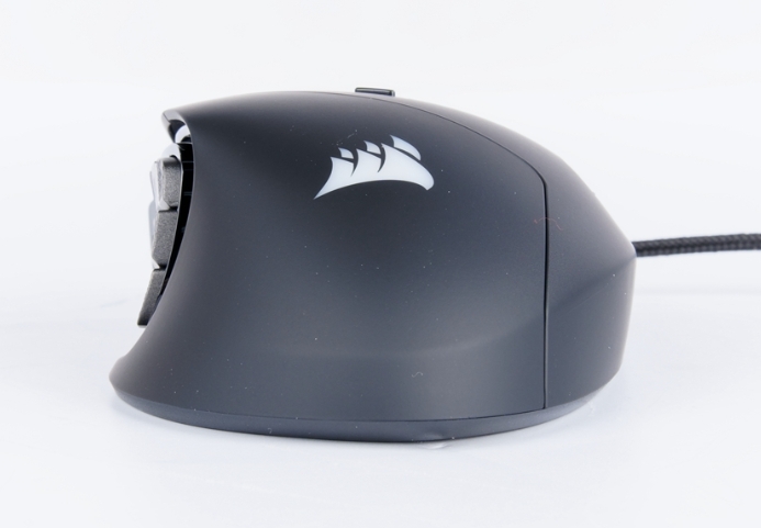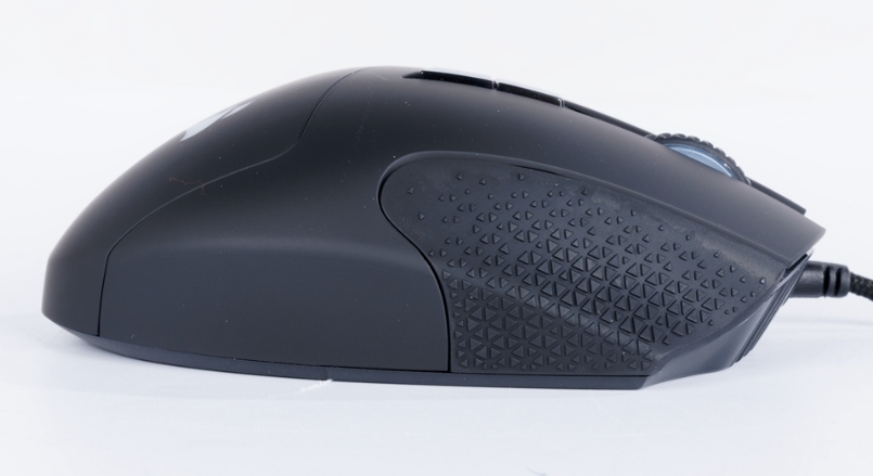 Corsair SCIMITAR RGB ELITE 제품의 외관은 전체적으로 무광 및 유광 블랙 색상 띄고 있습니다. 또한 마우스 사이드 부분에는 미끄럼 방지 고무처리가 되어 있습니다. 이로인하여 그립감적으로 매우 착 감기는 느낌을 들게 해줍니다. 좌우측의 고무처리가 되어있는 것은 면적의 55% 가량 되어 있으며, 마우스의 클릭버튼이 오른손잡이형으로 제작되었기 때문에 비대칭으로 이뤄져 있습니다.