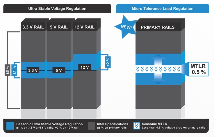 PSU에서 출력 전압 설계를 각 분할하여 전력을 공급하는 것이 아니라 전체 레일에서의 전력을 출력하기때문에, 전력 제한이 적습니다. 또한 시소닉의 기술력으로 인하여 안정적이고 뛰어난 성능을 제공합니다. 따라서 고성능 시스템에 매우 좋은 PSU가 될 것 같습니다.