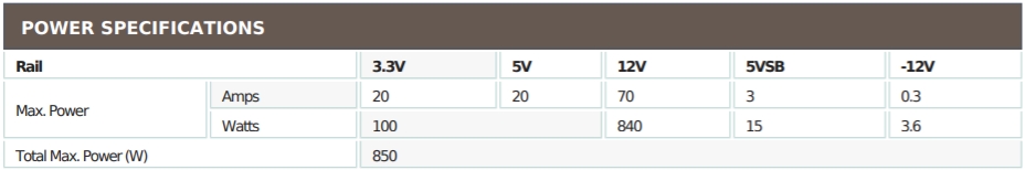 SEASONIC PRIME 850W TITANIUM 제품의 기본적인 DC 출력이며, 제품의 뒷면에서도 확인할 수 있습니다.