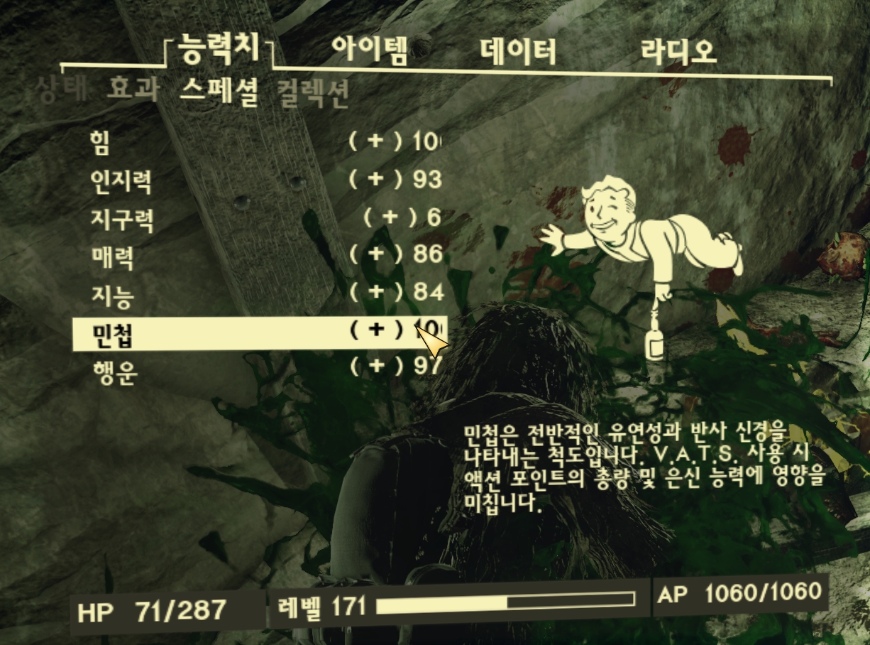 갓모드에 걸린것을 확인하시는 방법은 총알을 쏘셔서 HP가 달지 않는 것을 확인 하실 수 있으며, 불굴 방어구를 착용하셨다가 벗었다 반복하시면 무게 게이지가 올라가시면서 스탯 또한 상승하시게 됩니다.