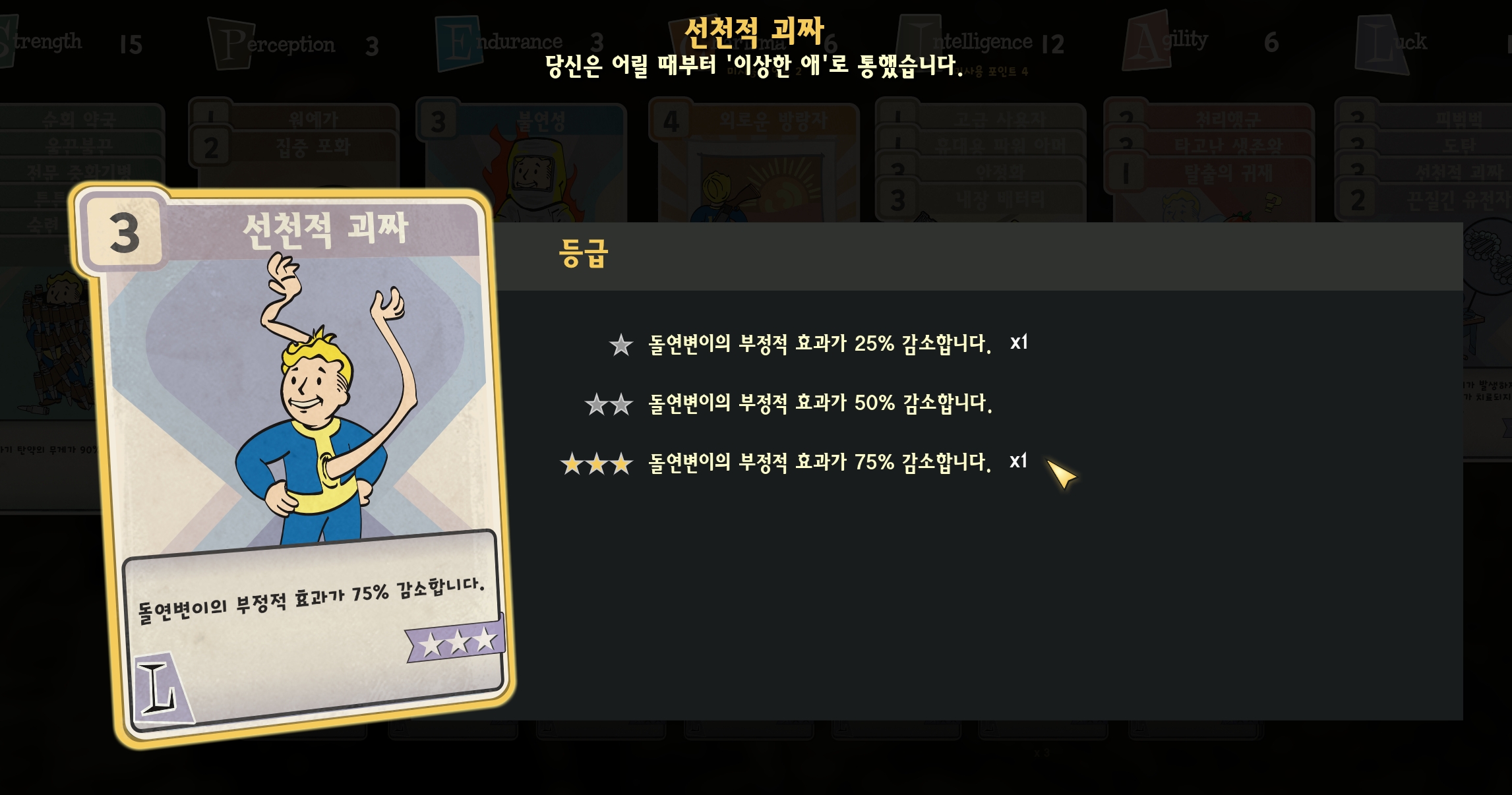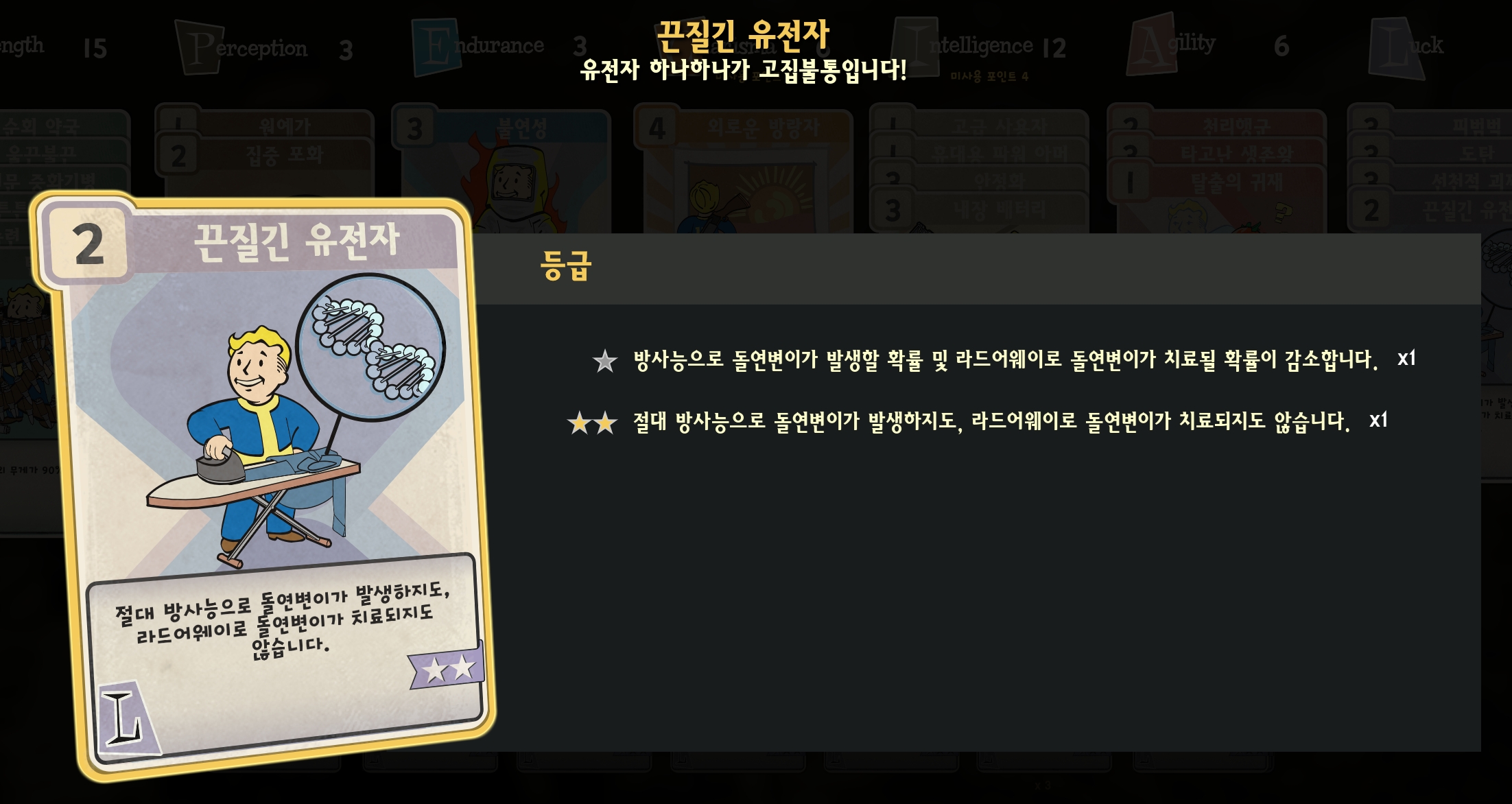 | 끈질긴 유전자 : 절대 방사능으로 돌연변이가 발생하지도 않으며, 라드어웨이로 돌연변이가 치료되지도 않습니다. 즉 원하시는 돌연변이를 획득하여 꾸준히 유지할 수 있는 퍽카드 입니다. 꼭 2성까지 강화하셔야 좋으니 32레벨이 되신다면 꼭 찍어주세요 선천적 괴짜 : 돌연변이가 걸릴 경우 긍적적인 효과와 부정적인 효과가 같이 공존하게 되는데, 부정적인 효과를 감소시켜 줍니다. 따라서 돌연변이를 유지하시게된다면 필수 퍽카드라고 생각 합니다. |