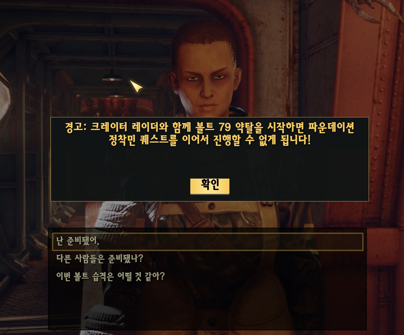 | 레이더 진영 리더인 매그에게 대화를 하게되면 경고 메세지가 노출됩니다. 이 메세지는 레이더 진영과 같이 볼트79에 진입하게되면 정착민 퀘스트가 진행이 불가능합니다. 이에 따른 큰 문제는 없으니 확인해주시고 대화하시면 됩니다. 그 동안 진행하였던 정착민 퀘스트는 실패하게 됩니다. |