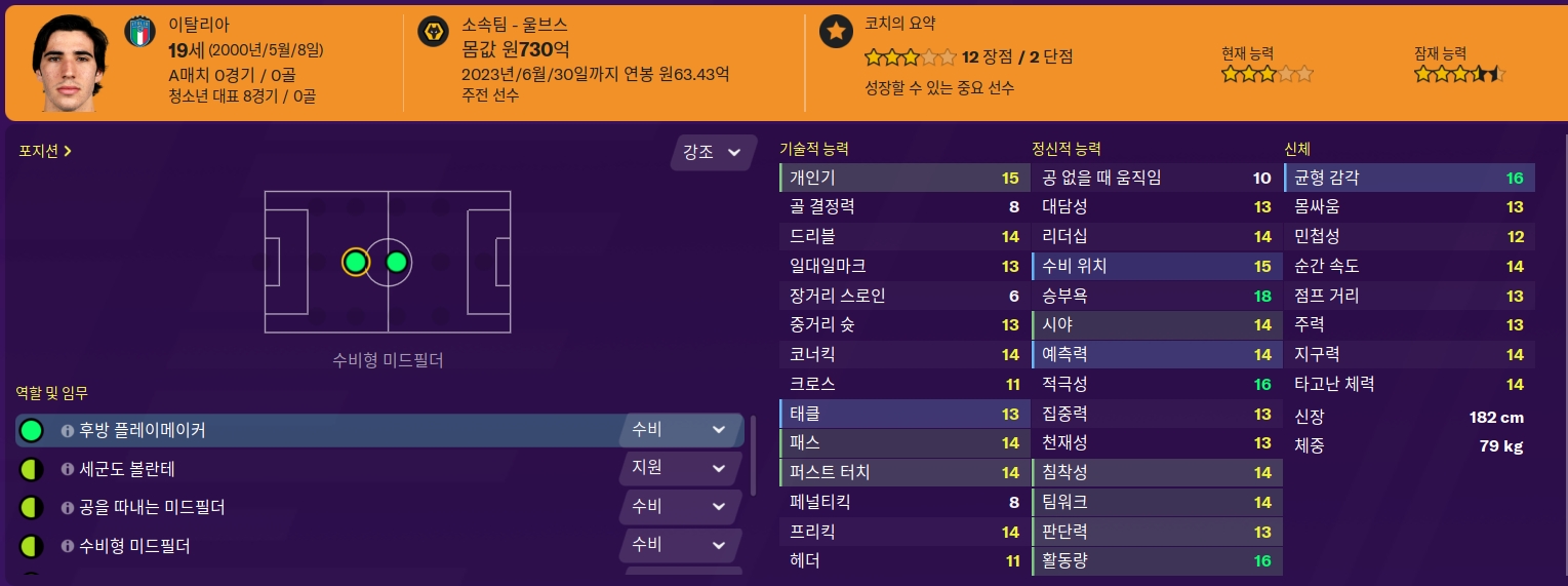 | 수비형 미드필더이며, 선호 포지션은 후방 플레이 메이커 입니다. FM2020에서는 본좌로 구분되는 유망주이기도하며, 뛰어난 공격과 수비 능력을 보여 줍니다. 특히 공격적인 플레이에서 뿌려주는 패스도 매우 뛰어나며, 중거리가 매우 뛰어나 세트피스 이후 세컨볼에 대한 중거리 슛으로 생각보다 많은 득점을 해줍니다. 단점으로는 이적료가 생각보다 높다는 점인데, 팀에 자금이 충분하다면 수비형 미드필더에서 이 선수 하나면 정말 크게 만족하실 것이라 생각 합니다. |