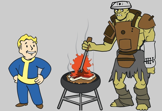 미트 위크를 기념하기 위해, 삼림에 있는 볼트 76 근처에서 매 시간마다 그람이 좋아하는 인간을 위해 고기 요리를 만듭니다.