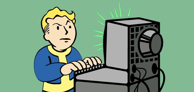 아트: 웨이스트랜더 사진 모드 액자에서 볼트 보이가 이제 레이저 머스킷이 아닌 소총을 어깨에 짊어지고 있습니다.