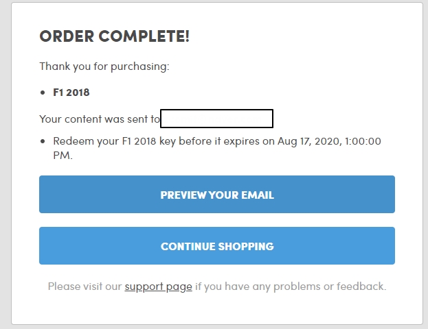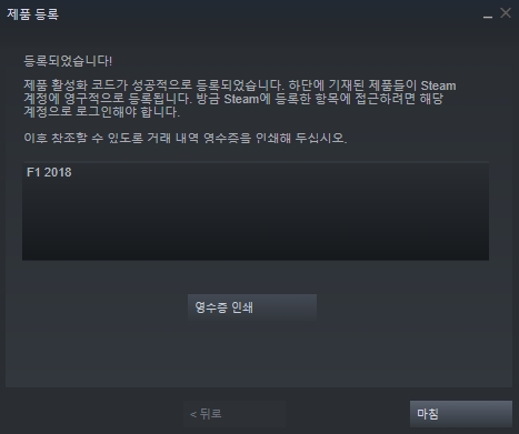 | Steam Key를 입력하시면 정상적으로 F1 2018 Steam 등록이 완료되신 것입니다. |