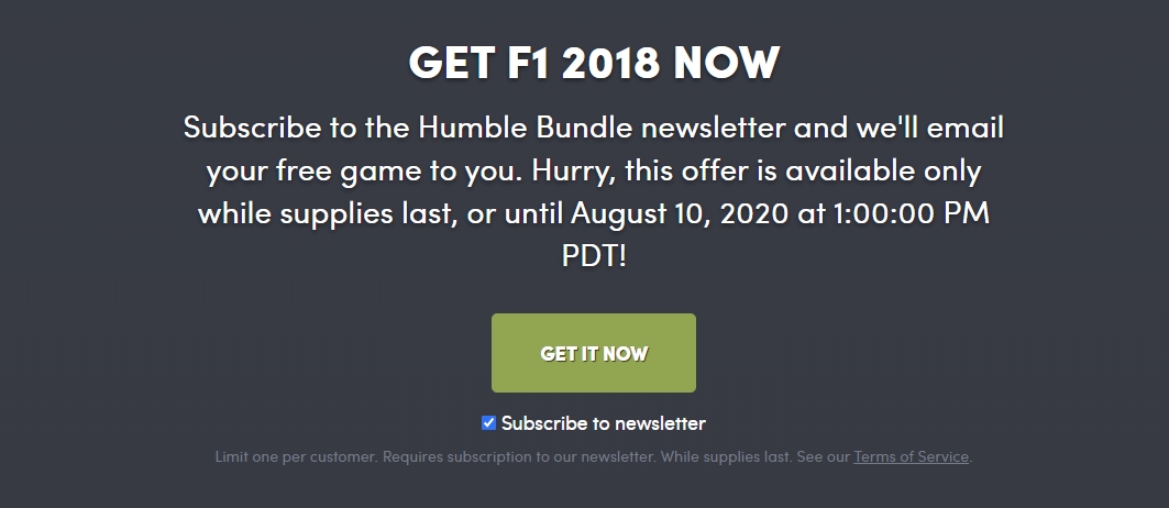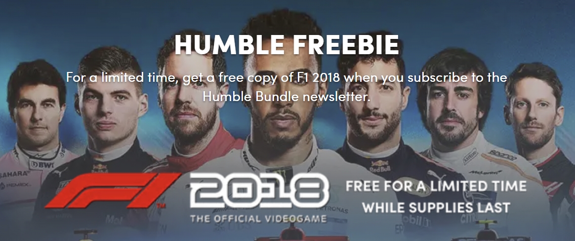 For a limited time, get F1 2018 for free and keep it forever, courtesy of Humble Bundle! While supplies last.