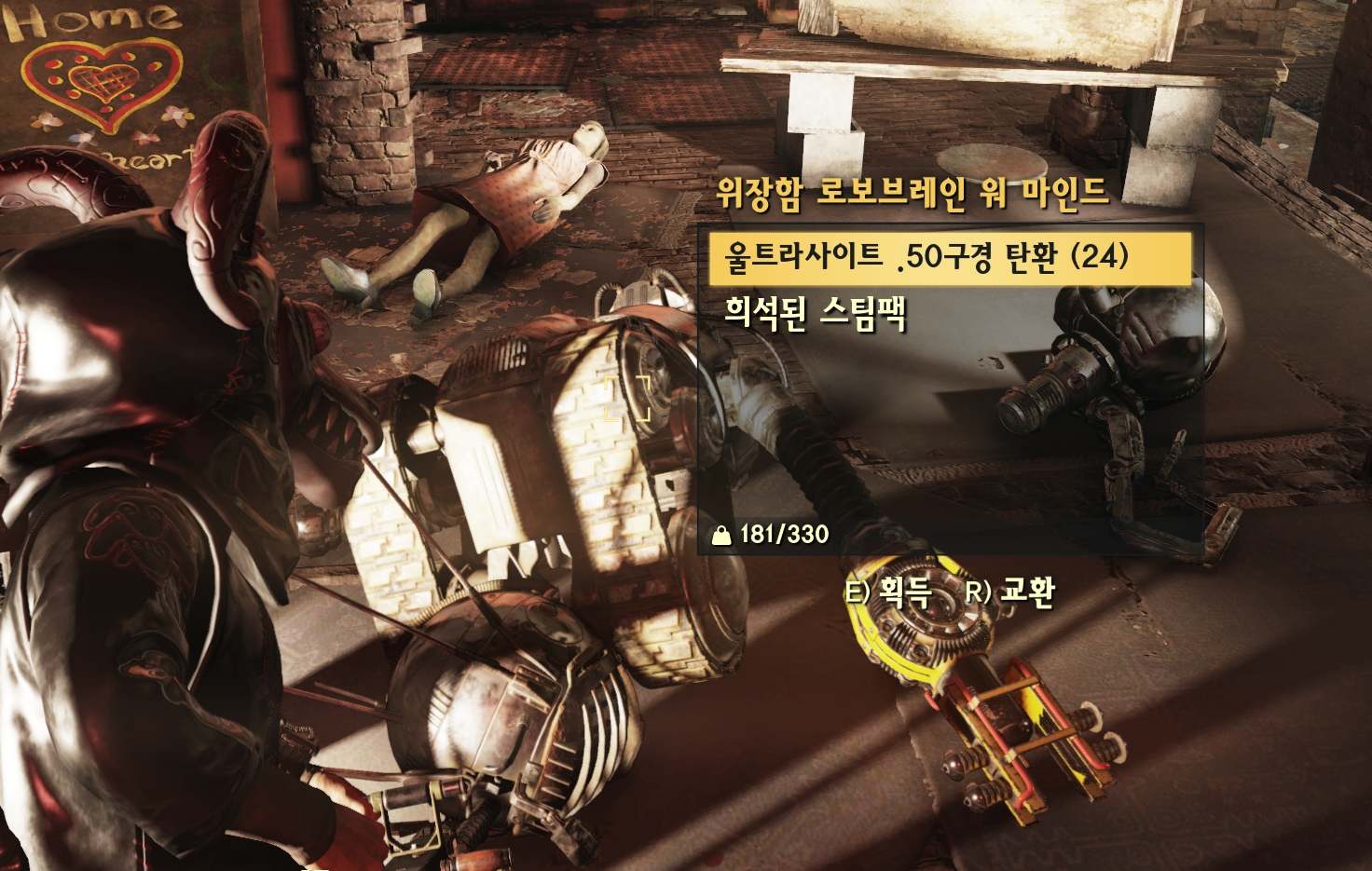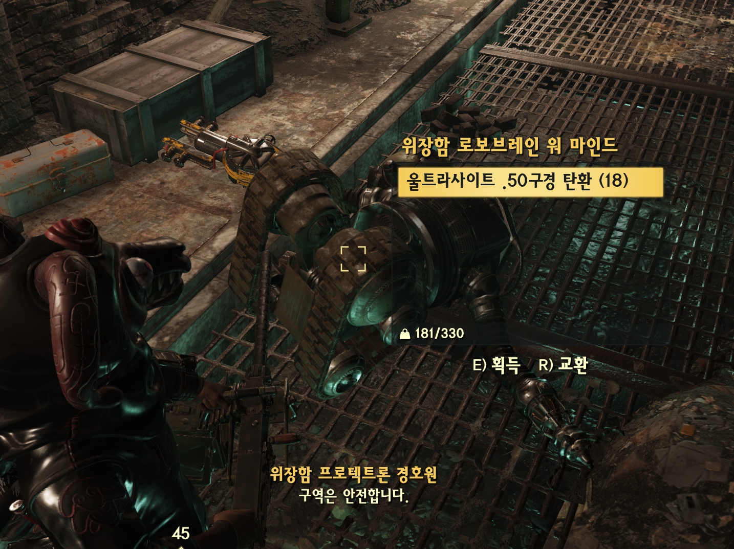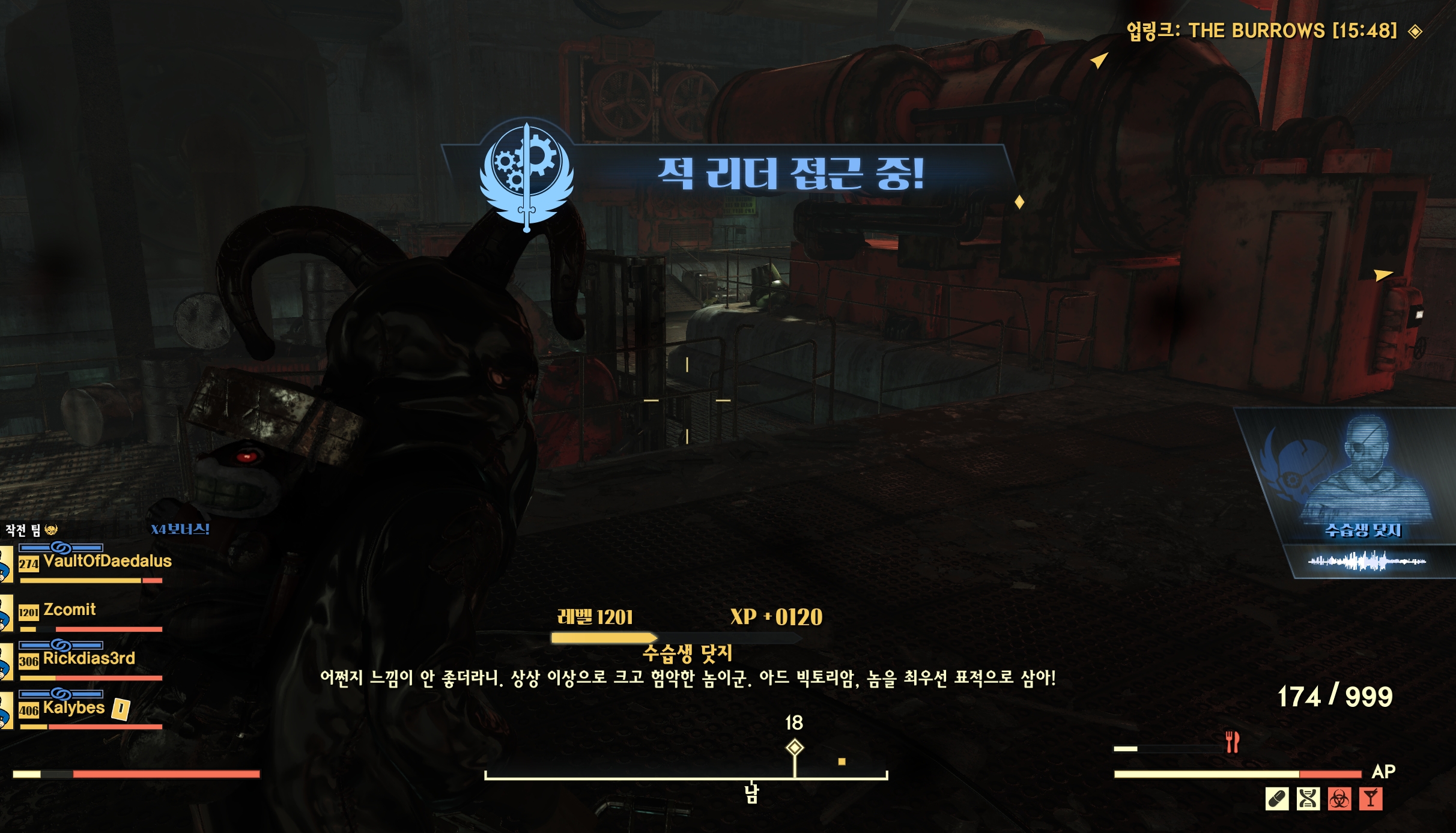 | 맵에서 존재하지 않는 곳으로 이동되며, 파티가 있을 경우 파티원들은 동일하게 참가가 가능합니다. 적 돌연변이 상태에 따라 위장이 활성화되며, 실제로 파워아머 불굴은 괜찮지만, 은신 소총수일 경우 매우 나쁜 효율을 보여줍니다. 몹을 잡을 경우 울싸 탄 종류를 드랍하며, 탄 수급도 매우 잘 되는것을 확인할 수 있습니다. |