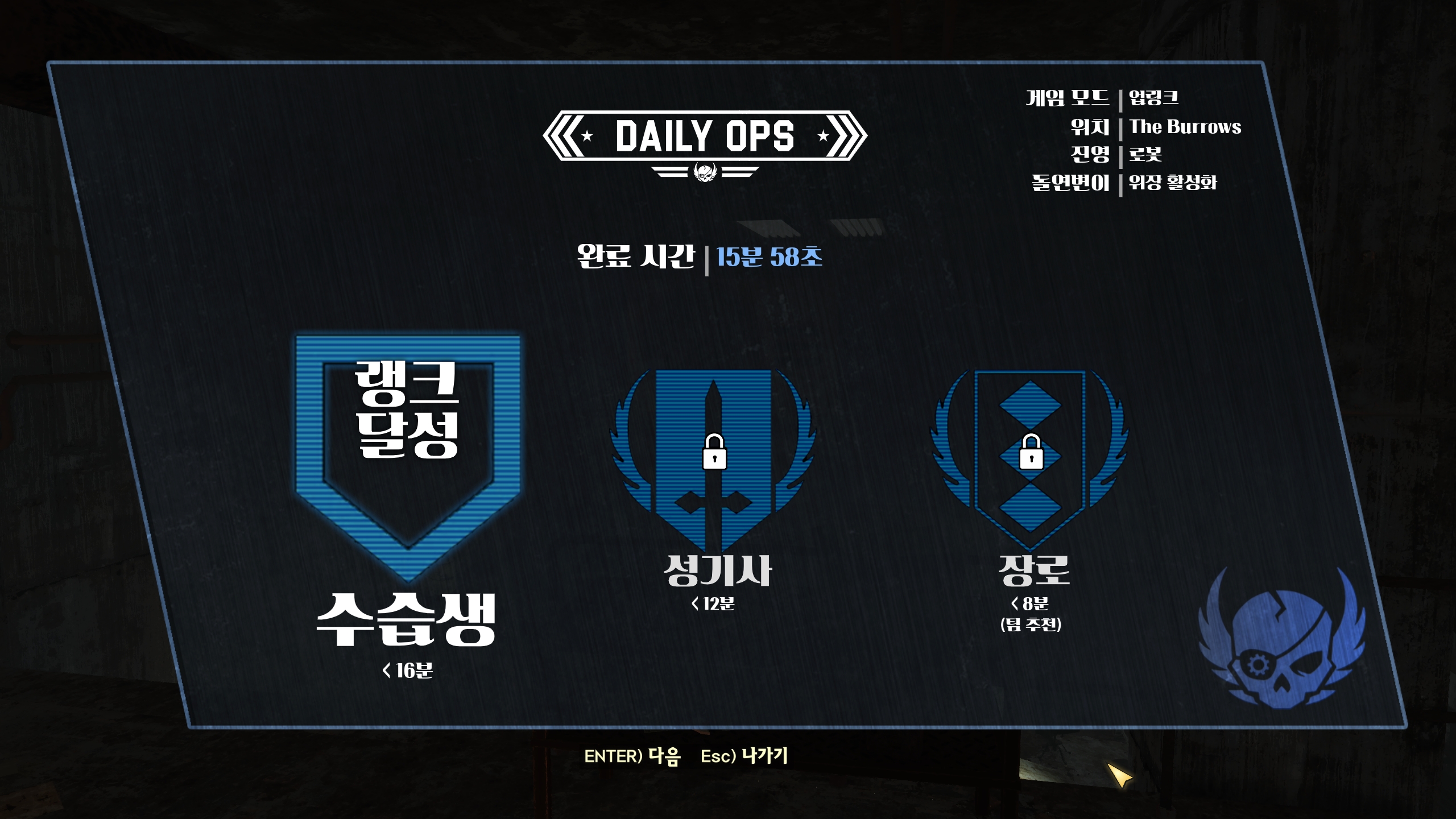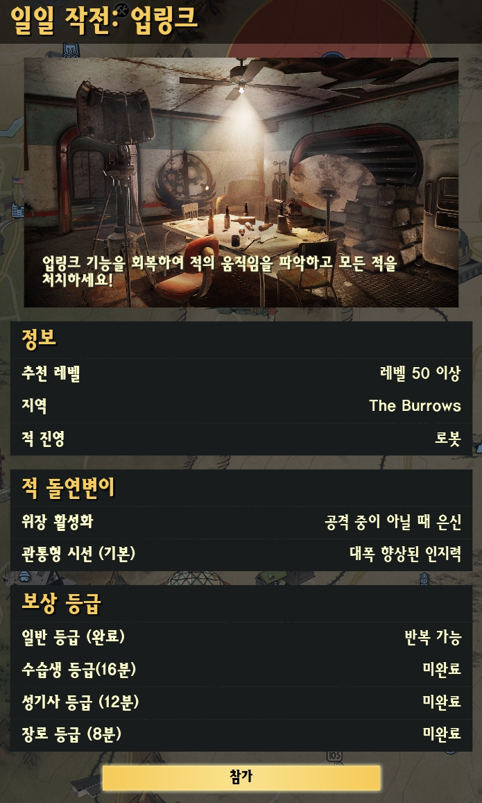 | 일일 작전을 클릭하면 작전에 대한 정보, 적의 돌연변이, 보상 등급을 확인하실 수 있습니다. |