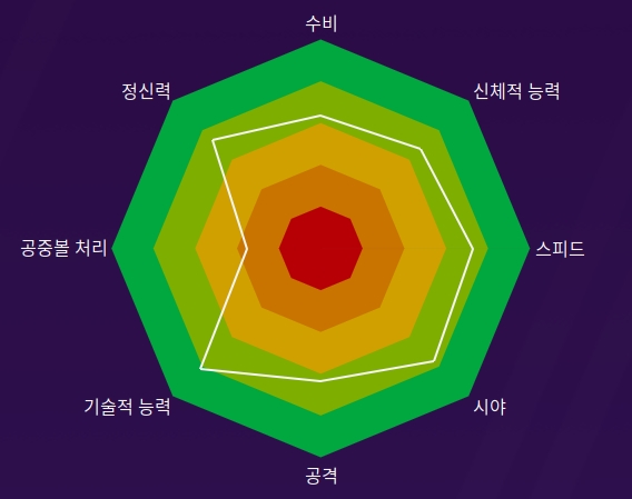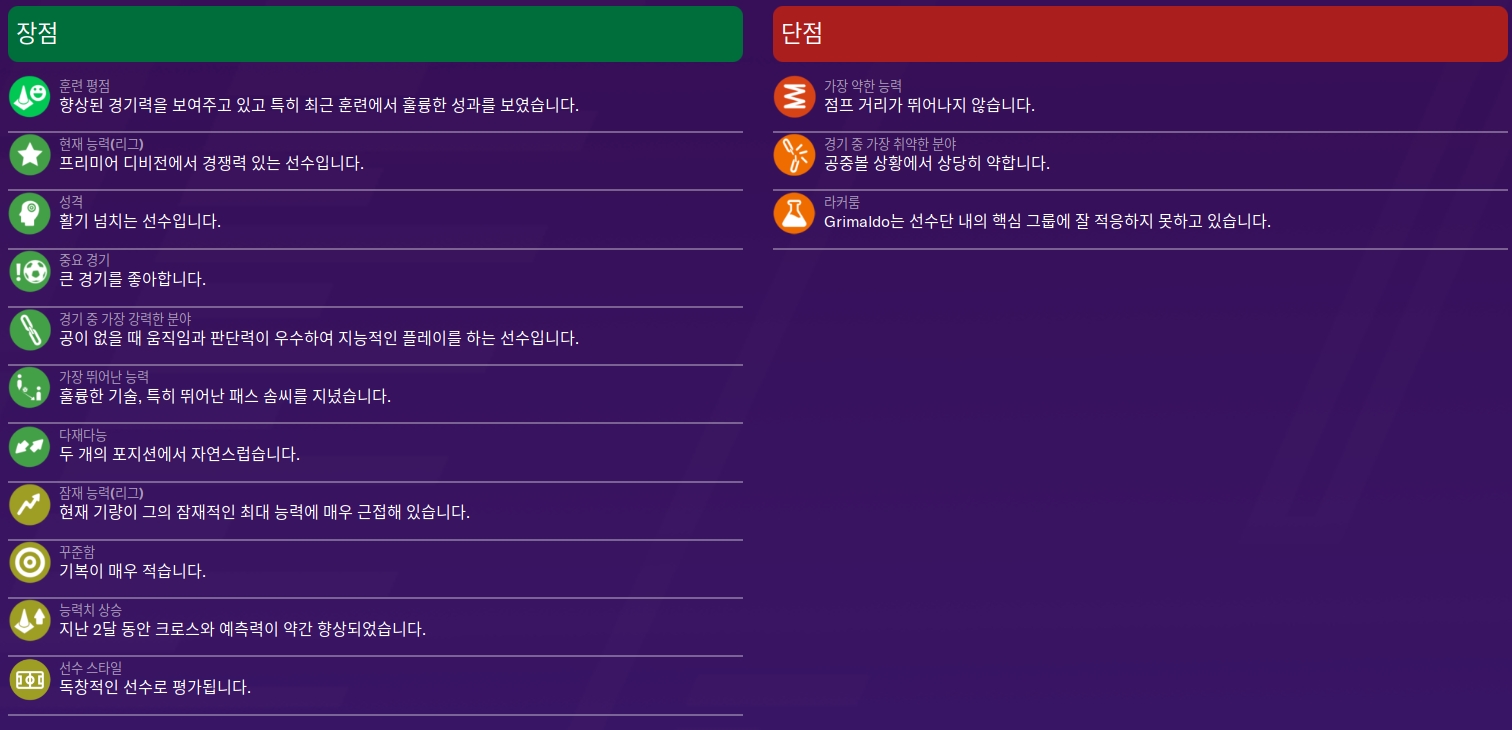 | 단점으로는 공중볼에서 아쉬운 모습을 보여주지만 그 외에는 리버풀 아놀드만큼 뛰어난 활약을 보여줍니다. 부상도 없어서 어느정도 체력관리만 해준디면 꾸준히 사용하실 수 있는 공격형 윙백 자원 입니다. 전 이 선수를 항상 팀의 왼쪽을 맡길 만큼 굉장히 만족도가 높은 선수 입니다. |