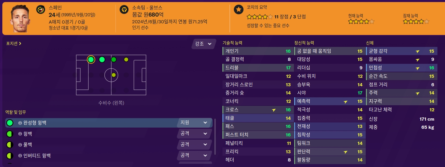 | 완성형 윙백이며, 또한 후선 미드필드에서 왼쪽 선수 중 TOP5에 든다고 생각하는 선수 중 하나입니다. 유망주는 아니지만 비교적 어린나이대이며, 왼쪽 공간을 지배하는 모습을 보여줍니다. 첫 시즌부터 왕성한 활동 그리고 드리블, 거기다가 수비적인 능력까지 뛰어납니다. 윙백 포지션 대부분에서 자연스럽게 뛸 수 있으며, 제일 좋은 포지션은 공격형 윙백으로 사용하시면 굉장히 효율좋은 모습을 보여 줍니다. |