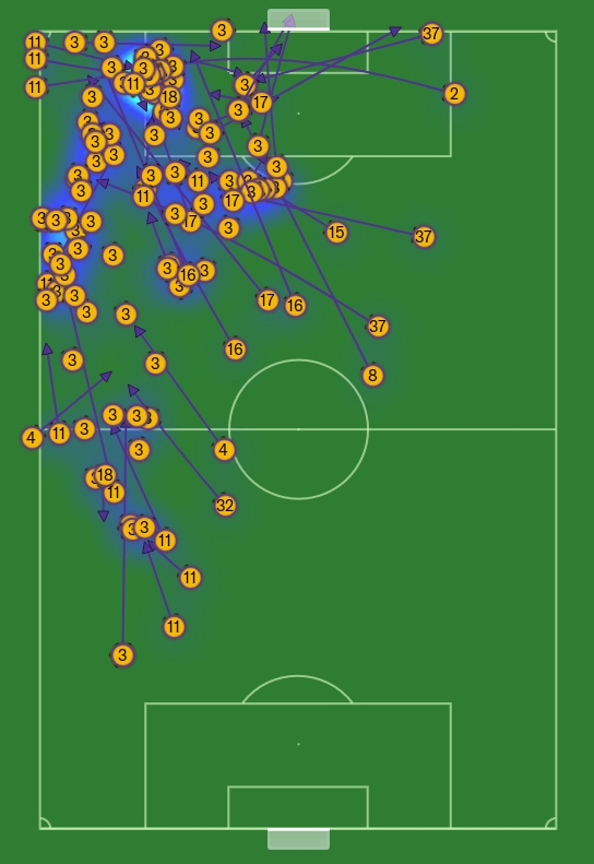 | 왼쪽 미드필더 히트맵 | 공격형 윙백 히트맵 |