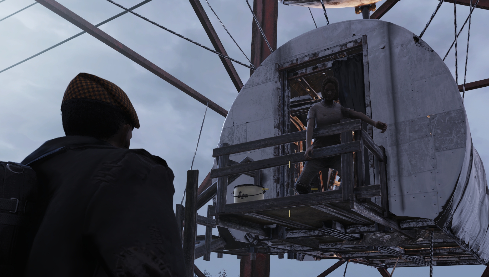 | 로즈와 대화하세요. (선택) 식인종 퍽카드를 장착하고 구울 고기를 먹으세요. |