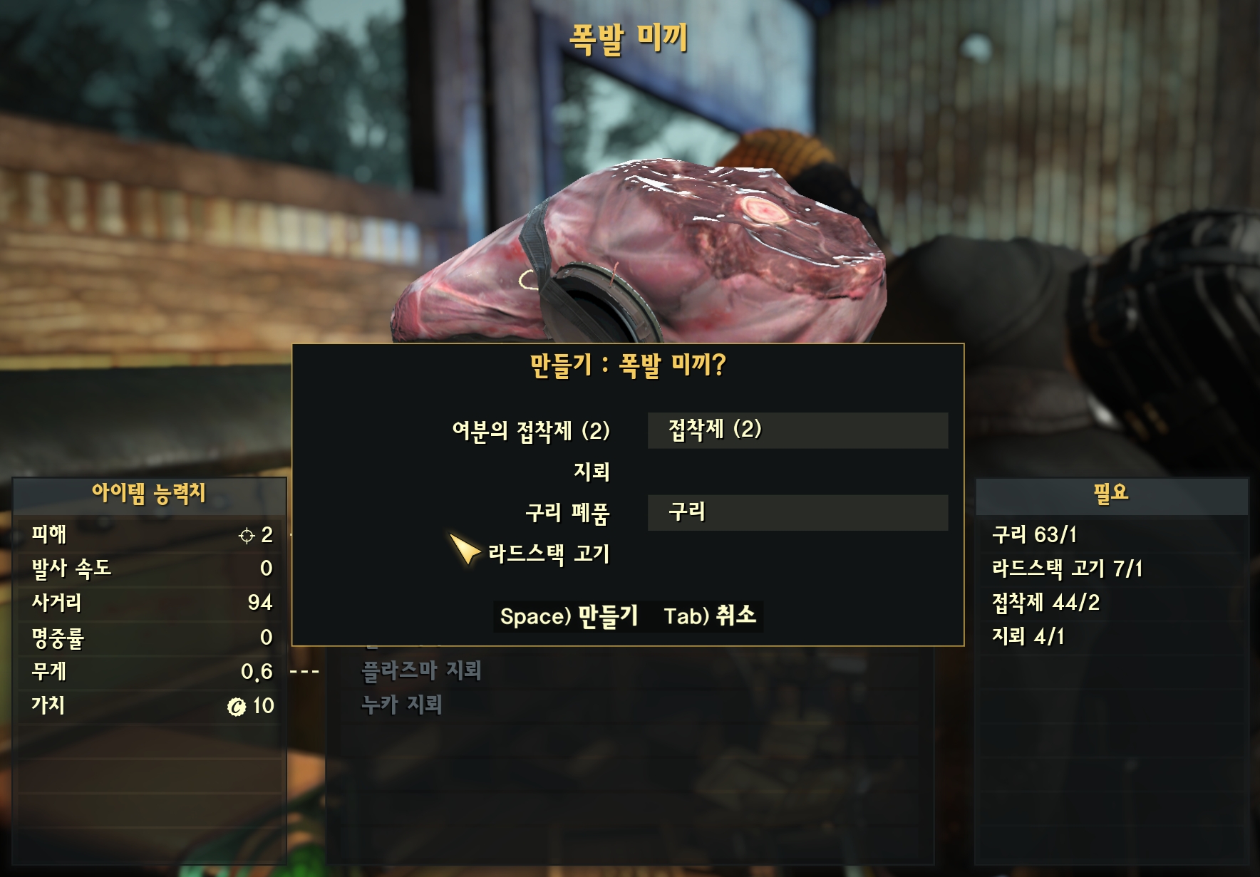 | 구리(1) | 라드스텍 고기(1) | 접착제(2) | 지뢰(1) |
