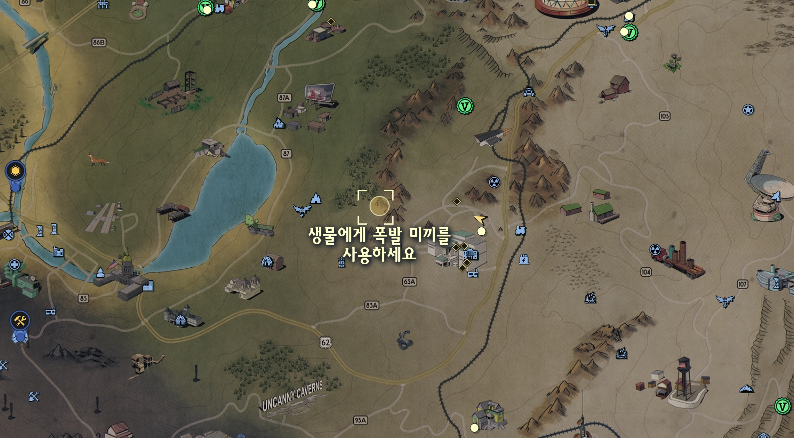 | 맵에서 중앙에 위치한 "화이트스프링"에서 10시 방향의 퀘스트마커로 이동해주세요! 아이템 > 무기에서 폭발 미끼를 장착도 해주세요! Tip : 퀘스트마커 지역에서 들개가 죽어있다면 세션을 이동해주세요! 들개가 없다면 퀘스트가 진행되지 않습니다! |