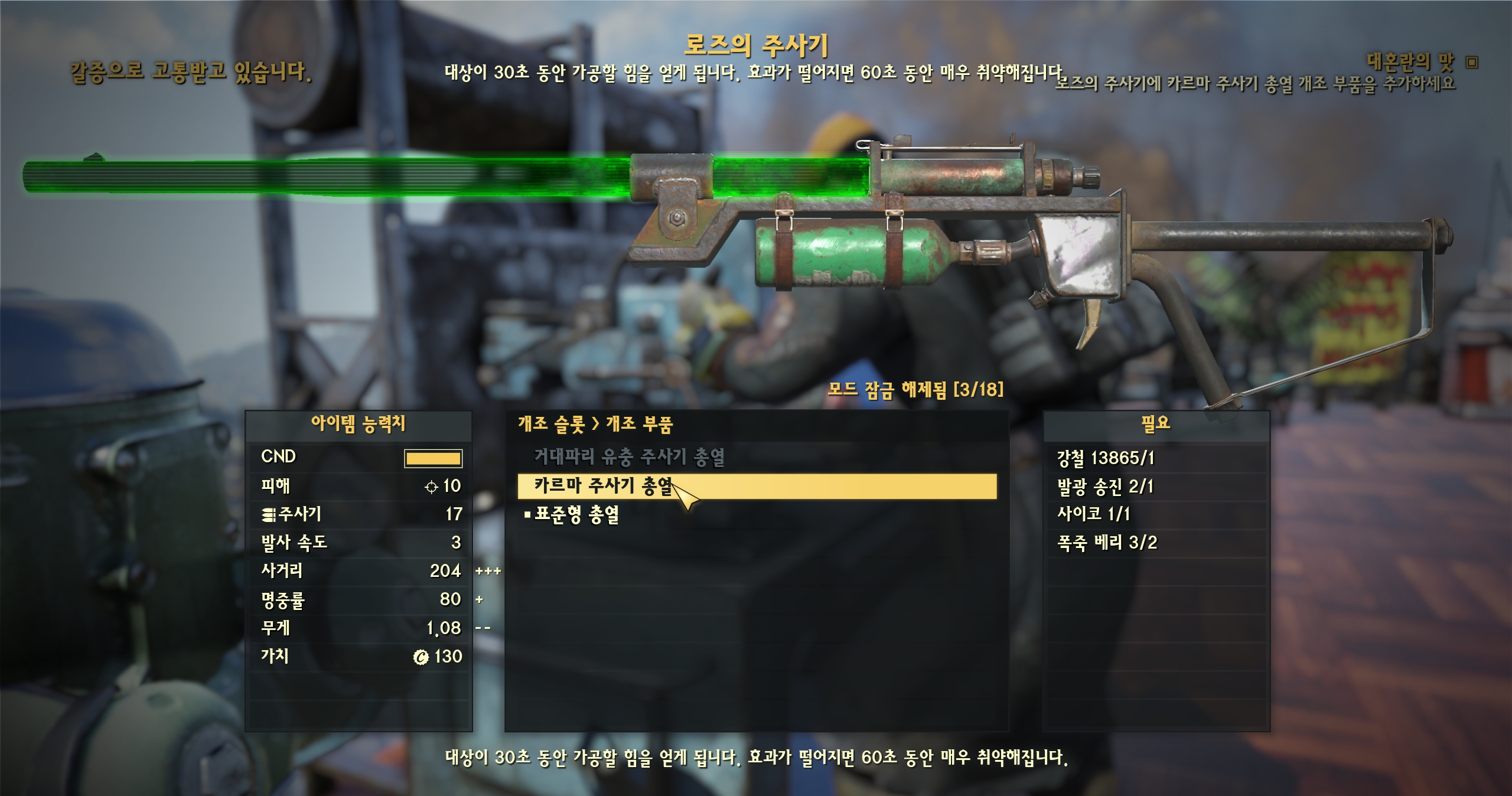 | CAMP의 무기제작대에 가셔서 로즈의 주사기 무기에 카르마 주사기 총열로 개조해주세요! |