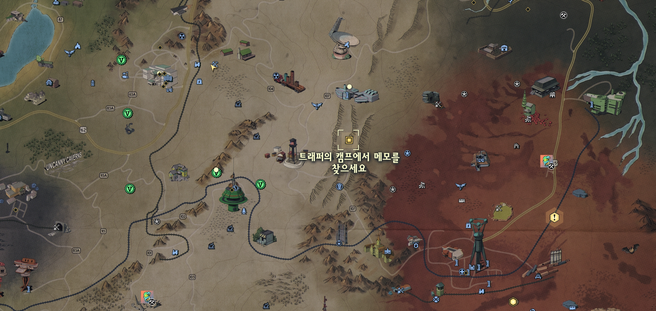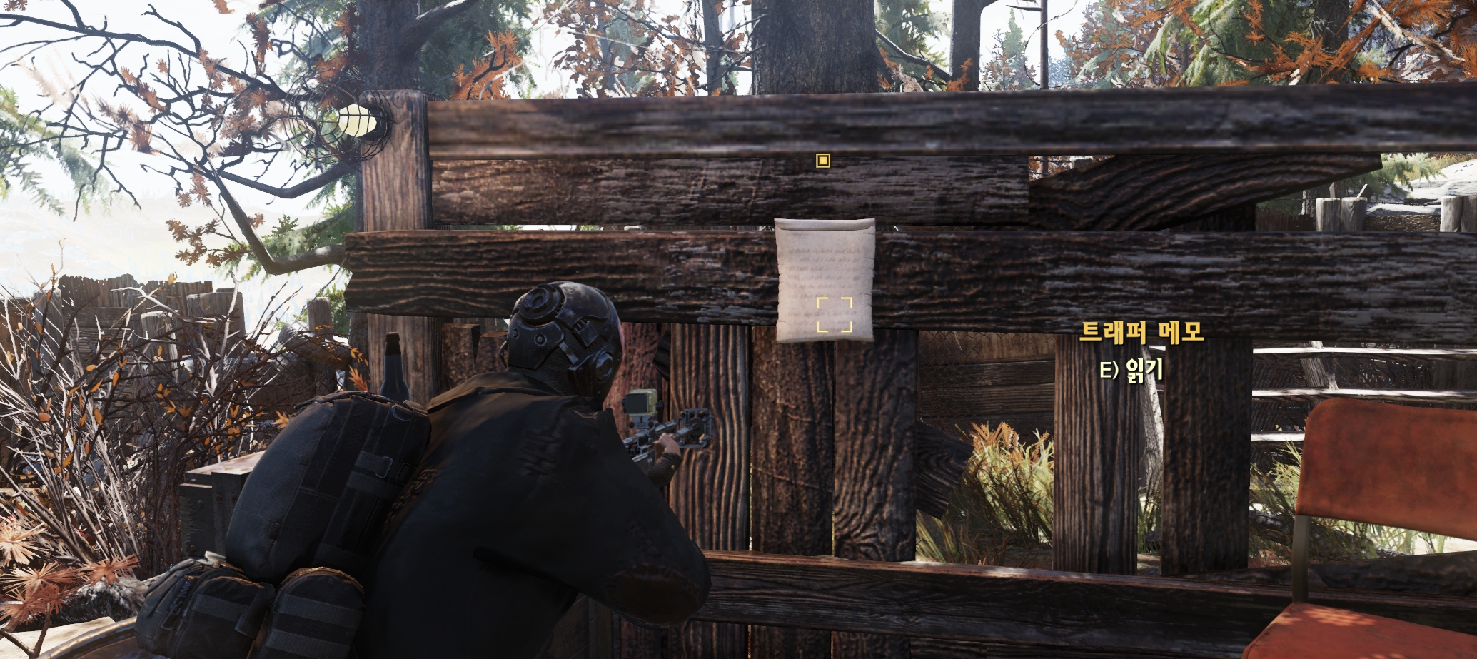 | 맵에서 중앙에서 3~4시에 위치한 트래퍼의 캠프로 이동해주세요. 그곳에서 트래퍼의 메모를 확인해주세요. |
