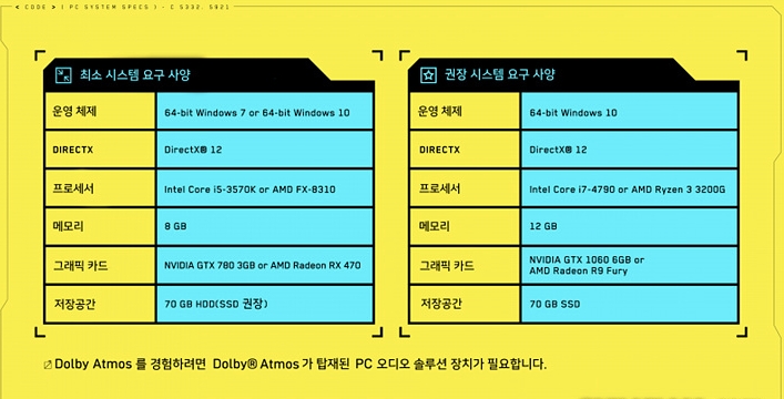 2020년 9월 19일 공식적인 PC 사양이 공개되었습니다. 다만 아쉬운점은 사이버펑크2077 공식 홈페이지에 올라와있는 스펙에 비하여 최소 1~2단계는 높게 잡으셔야 원할한 플레이가 가능할 것 같습니다. 이유는 공식홈페이지에서 작성된 PC사양보다는 실제 벤치마크 결과 다소 프레임이 높게 나오지 않았다는 점이 확인되었기 때문입니다.