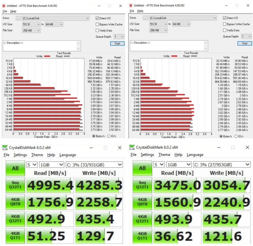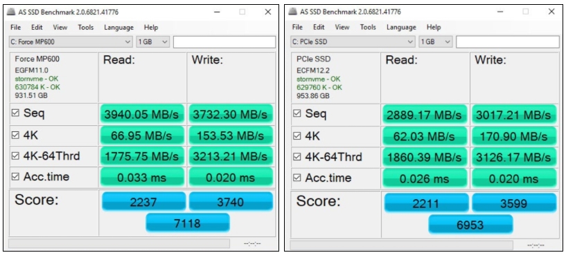 CrytalDiskmark에서는 CORSAIR Force Series MP600 M.2 2280 성능에 준하는 속도가 측정되었지만, AS / ATTO에서는 성능에 못미치는 속도가 측정되었습니다.