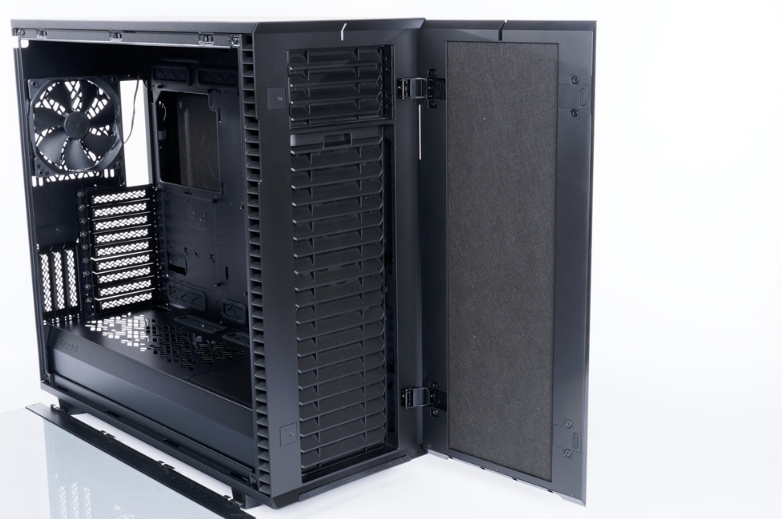 | Fractal Design Define XL 전면부에는 개폐형 매쉬로 되어져 있으며, 내부에는 먼지망이 추가적으로 구성되어 있습니다. 청소같은 경우 전면부를 열어 먼지망을 통하여 손쉽게 청소가 가능하였습니다. 또한 전면부 하단에는 새로운 로고를 확인할 수 있었습니다. |
