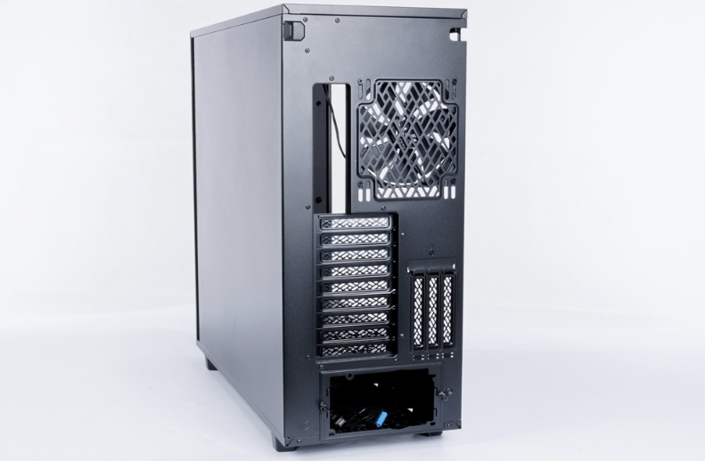 | 후면부에는 팬을 1개 설치가 가능하며, 여유로운 확장 슬롯을 제공하고 있습니다. 특히 이번 디자인에서는 타공망 형태의 소켓모습이 아닌 새로운 소켓으로 보여집니다. 다만 후면에 돌출된 확장슬롯 부분이 있어서 조립 시 다치지않도록 조심하시기 바랍니다. |
