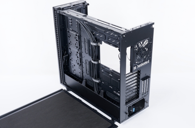 | Fractal Design Define XL 양쪽 옆면에는 한쪽은 강화유리 글라스로 되어 있습니다. 글라스는 개폐형으로 매우 손쉽게 오픈하여 하드웨어 접근성이 높아졌습니다. 또한 다른 옆면에는 케이블의 정리할 수 있는 공간이며, 상단에 RGB 컨트롤러를 장착하여 손쉽게 메인보드와 연결하실 수 있습니다. 추가적으로 케이블선이 나오는 곳에 고무처리가 되어있어서 최대한 정숙성을 유지할 수 있도록 하였습니다. |