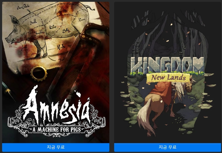 에픽게임즈에서 2가지 무료 게임을 배포 합니다. 이번주 무료게임은 2가지로 1인칭 호러게임 암네시아와 인디게임 전략 생존 시뮬레이션인 킹덤 : 뉴랜드를 무료 배포를 하고 있습니다. 두개다 재미적인부분보다는 라이브러리를 채우시는 용도로 생각하시면 좋을 것 같습니다.