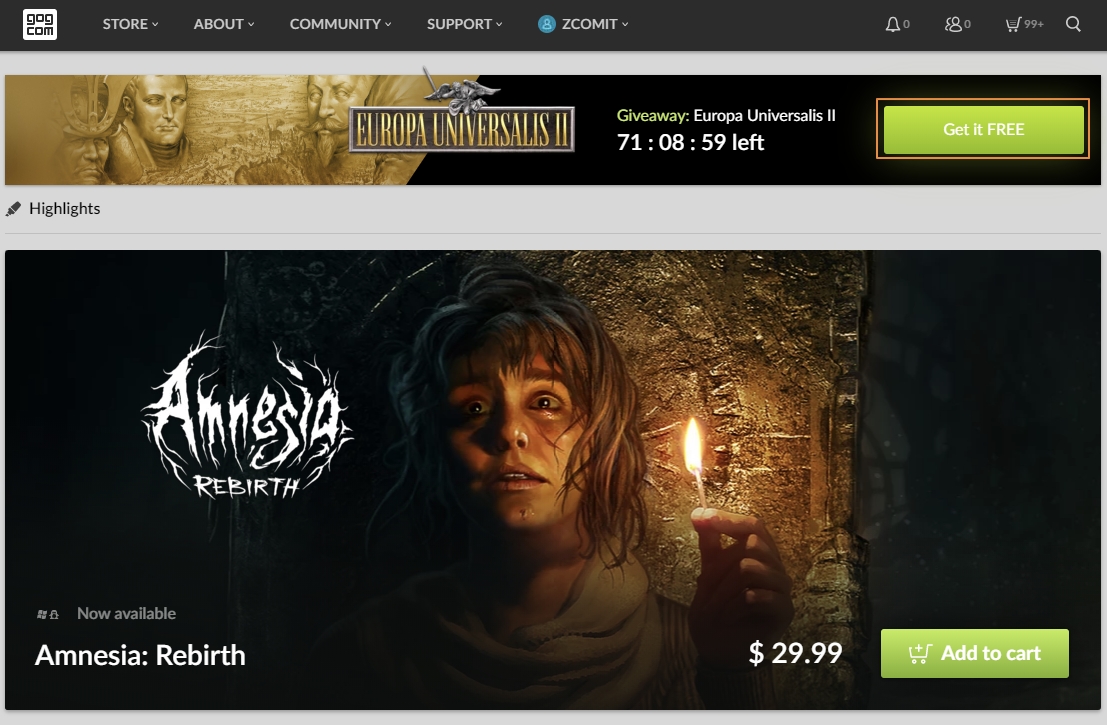 | GOG 사이트 링크를 클릭하여 사이트에 접속해주세요. 그리고 화면 제일 위에 " Get it Free" 버튼을 클릭해주세요 |