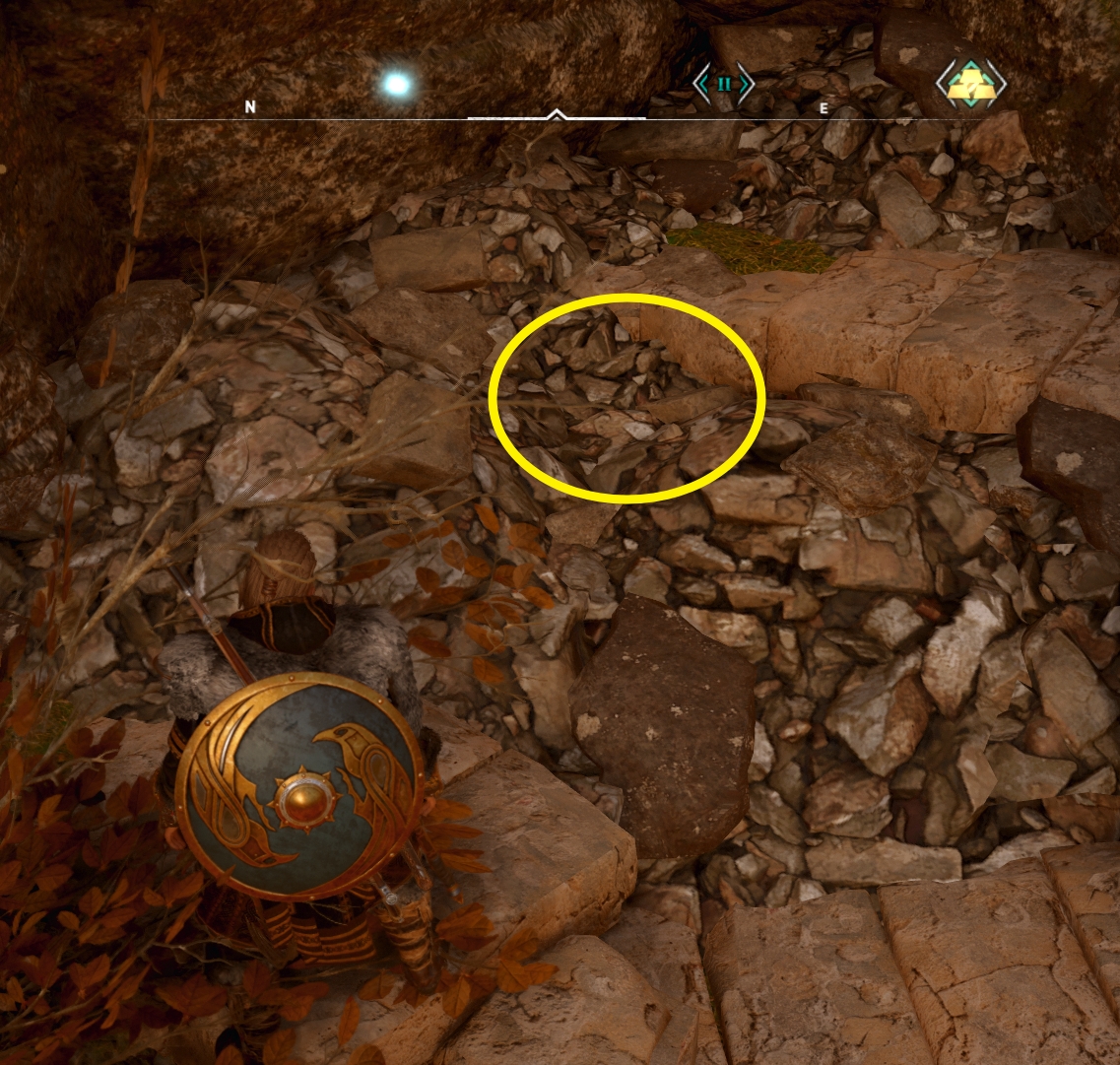 | 커다란 절벽 아래쪽 나무 뒤에 돌더미에 보물이 숨겨져 있습니다. |