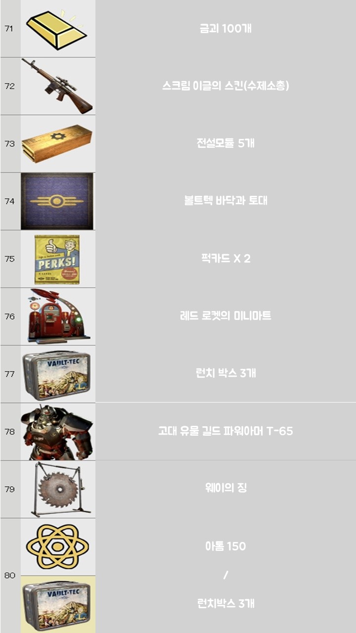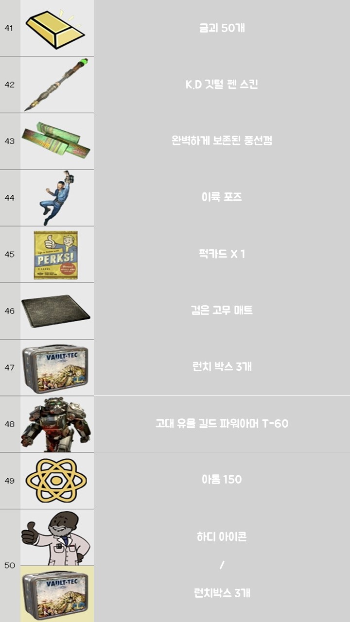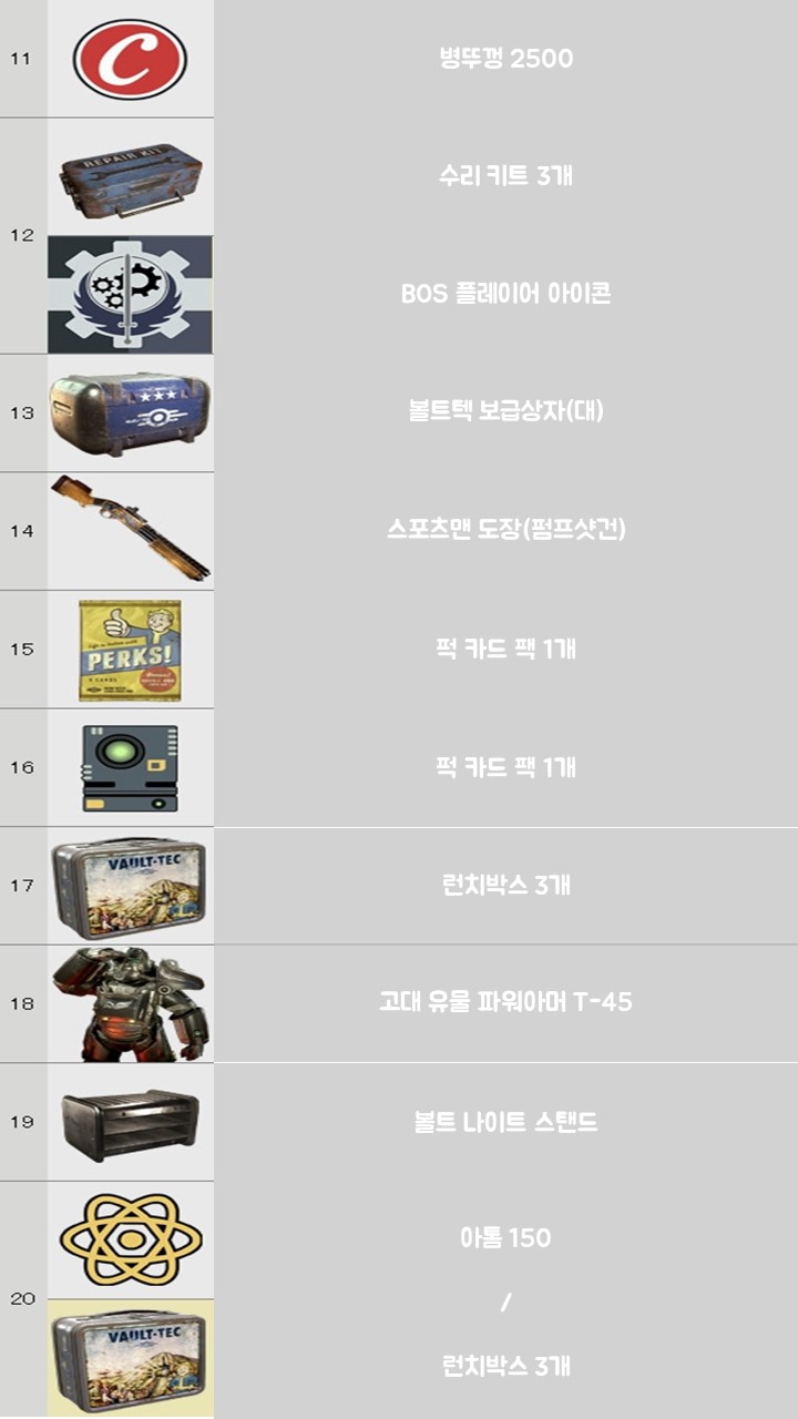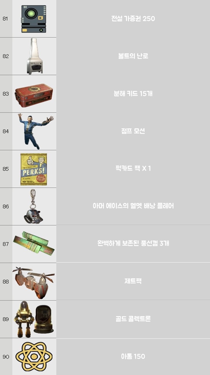 2020년 12월 15일 폴아웃76이 시즌3로 업데이트 됩니다. 시즌2에 비하여 비교적 다소 아쉬운 보상안이 정해졌지만, 베데스다에서 꾸준히 이벤트와 업데이트를 해주는것이 참 고맙다고 생각이 듭니다. 이번 보상안에서는 시즌2와 같이 아톰, 금괴, 스킨, 하우징 아이템 등 다양하게 추가되었으며, 자세한 내용은 아래 베데스다 공식 홈페이지 참고를 부탁드리겠습니다.