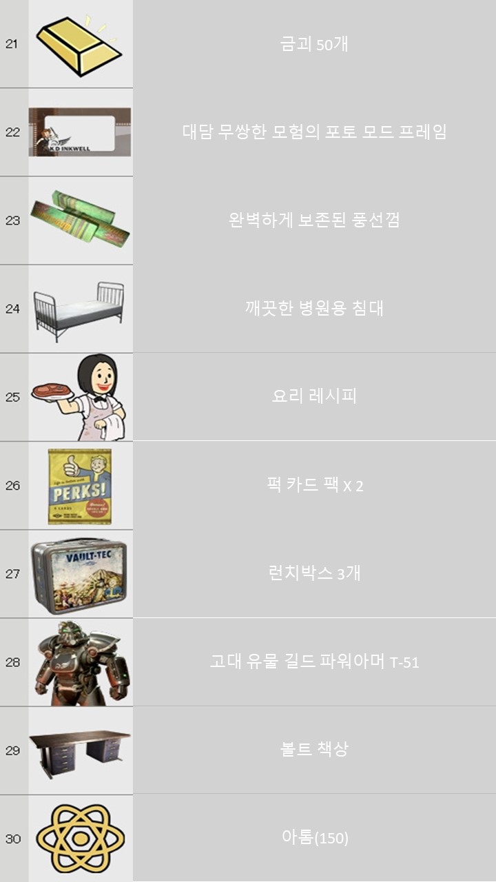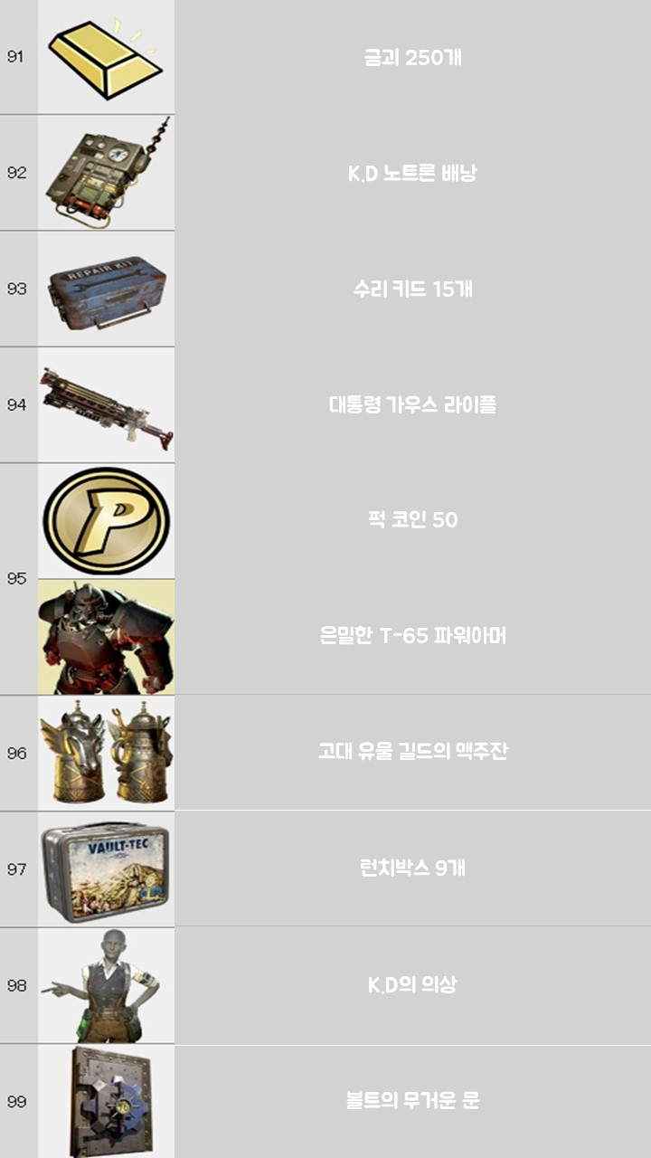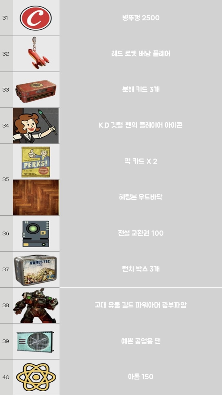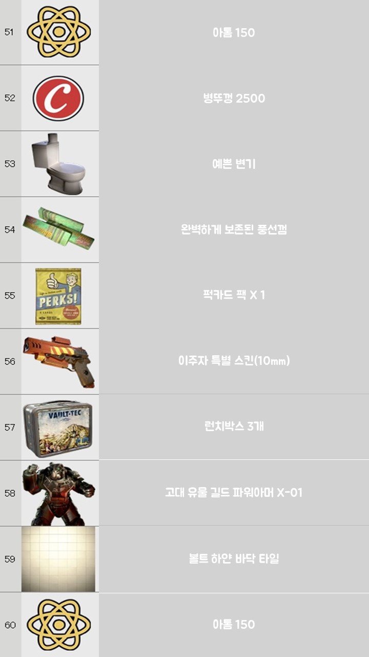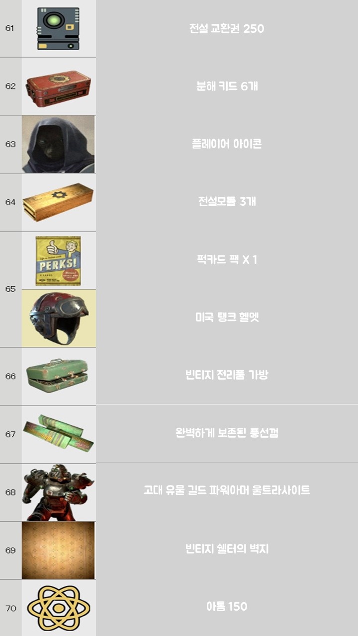 2020년 12월 15일 폴아웃76이 시즌3로 업데이트 됩니다. 시즌2에 비하여 비교적 다소 아쉬운 보상안이 정해졌지만, 베데스다에서 꾸준히 이벤트와 업데이트를 해주는것이 참 고맙다고 생각이 듭니다. 이번 보상안에서는 시즌2와 같이 아톰, 금괴, 스킨, 하우징 아이템 등 다양하게 추가되었으며, 자세한 내용은 아래 베데스다 공식 홈페이지 참고를 부탁드리겠습니다.
