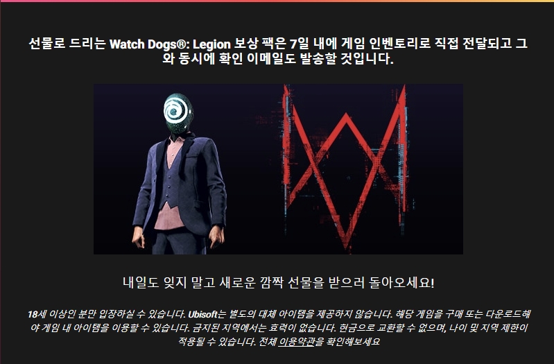 유비소프트에서 연말을 기념하여 무료게임 컨텐츠를 배포 합니다. 2020년 12월 16일 현재 와치독스 리전 무료 의상이 지급되고 있습니다. 다만 18세 이상만 다운로드를 받으실 수 있으며, 게임 내 아이템은 순차적으로 지급이 됩니다.다만 이번 홀리데이 보상이 아쉬운점은 와치독스 리전 게임을 소유하고 있지 않는 게이머에게는 의미없는 보상이지 않을까 생각 됩니다.