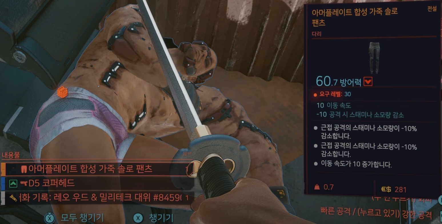 오늘의 리뷰는 사이버펑크2077 전설의상 위치, 솔로팬츠 입니다.