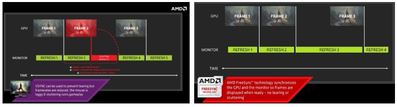화면이 어긋나는 현상을 흔히 테어링이라고 부르는데, 이 현상은 가변 주사율을 통하여 해결이 가능합니다. AMD의 FreeSync는 모니터의 주사율과 GPU의 주사율을 완벽하게 일치시켜 공백으로 발생되는 화면 어긋남을 방지하게 됩니다. 이로인하여 사용자에게 매우 부드러운 화면을 제공하게 되는 것입니다.