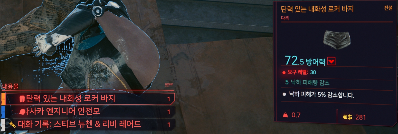 오늘의 리뷰는 사이버펑크2077 전설의상 위치, 로커바지 입니다.