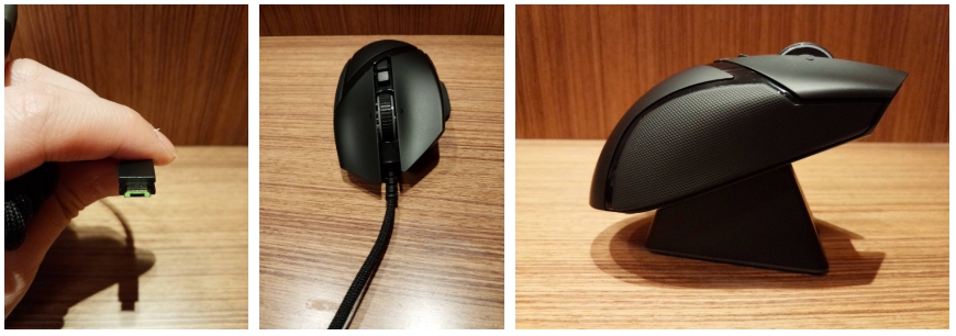 Razer Basilisk Ultimate는 유 무선을 지원합니다. 마우스 아래 2.4Ghz의 동글이 있으며, 케이블을 통한 유선 마우스로도 사용이 가능합니다.