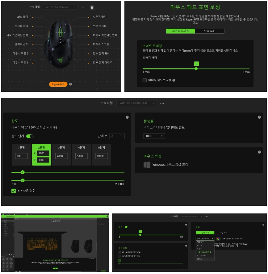 기본 민감도 설정 버튼 조정(800, 1,800, 5,000, 9,000, 20,000) 레이저 시냅스를 통한 유저가 원하는 민감도 설정 가능(X, Y 축 따로 설정 가능)