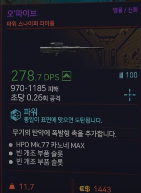 사이버펑크2077에서는 무기에 따른 등급이 존재합니다. 이중 가장 희소성 있는 무기는 게임 내에서 신화등급의 아이템일 것입니다. 이 신화등급 아이템에서는 퀘스트 보상 및 히든 미션을 통하여 획득하실 수 있습니다. 또한 신화등급의 아이템은 등급과 상관없이 신화라는 옵션이 붙을 수 있습니다.