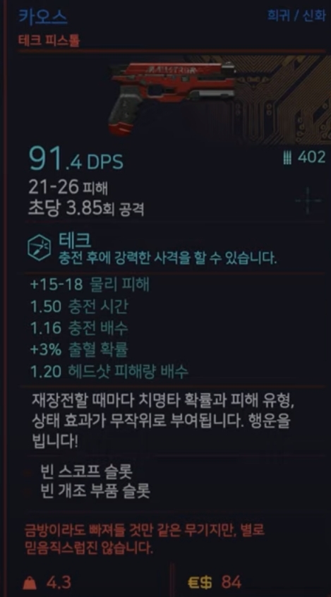 오늘의 리뷰는 사이버펑크2077 신화 무기 획득 방법, 카오스 or 둠둠 입니다.