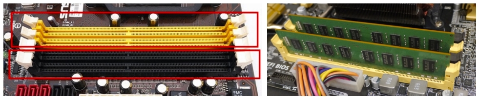 만약 RAM의 갯수가 8GB X 2개라면 RAM 슬롯의 2번쨰 4번째에 장착을 하셔야 합니다. 듀얼 채널에는 RAM 스틱 사이의 간격이 필요하기 때문에 이렇게 장착을 하셔야 하며, 특히 RAM을 장착하실때 양쪽의 클립이 떨어져있거나, 적당한 힘조절을 하여 메인보드 RAM 슬롯에 장착되는 부분을 끝까지 확인하시기 바랍니다.