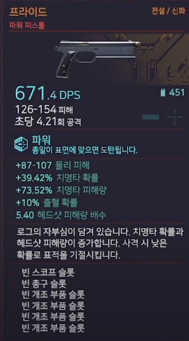 오늘의 리뷰는 사이버펑크2077 신화 무기 획득 방법, 프라이드 입니다.