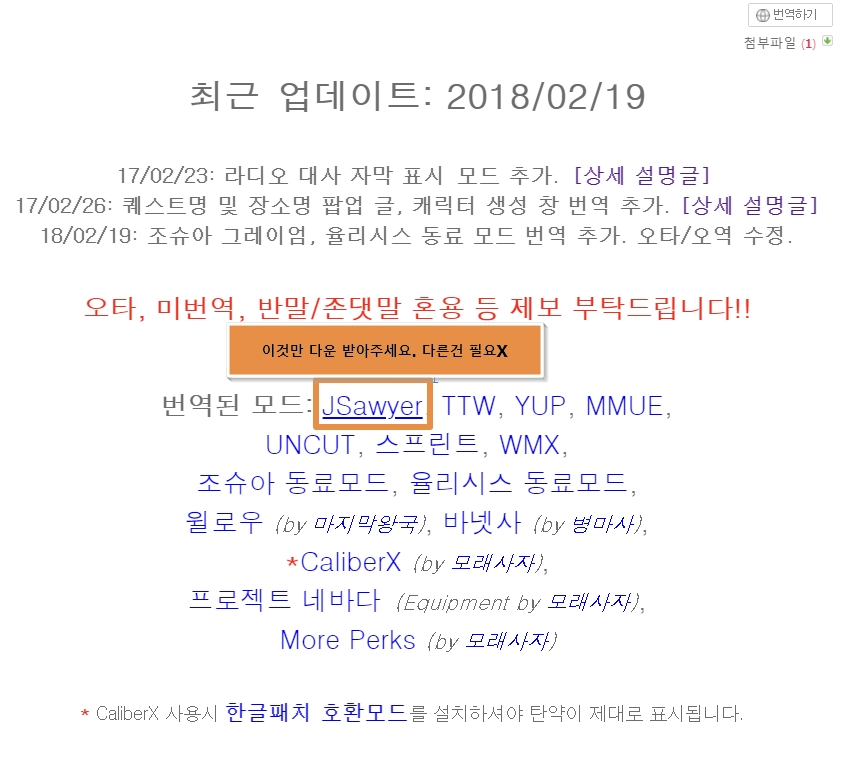 2020년 Jsawyer.esp 업데이트로 인하여 다른사이트에서 리뷰를 보시고 TTW[한글패치] 적용하실 경우 Jsawyer.esp 오류가 발생되니 이 글을 보시고 재설정하시기 바랍니다. |