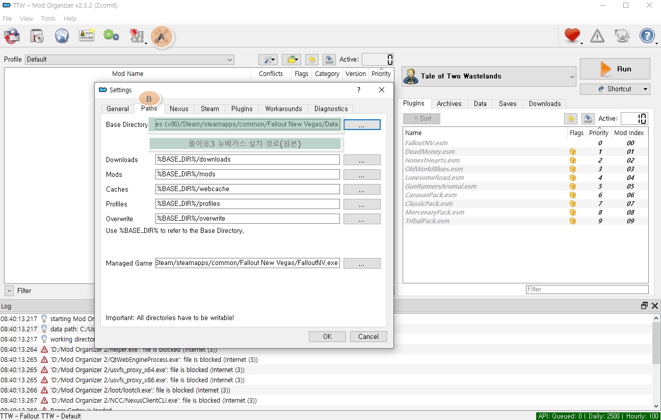 | Mod Organizer2 설정 클릭 Paths 클릭 base Directory > 폴아웃 뉴베가스 Data 경로 입력(스팀) -> C:/Program Files (x86)/Steam/steamapps/common/Fallout New Vegas/Data |